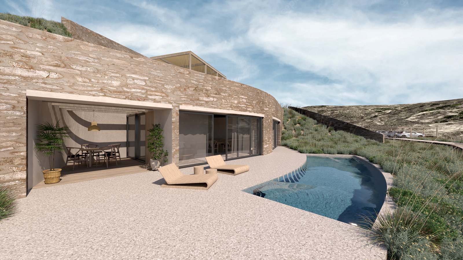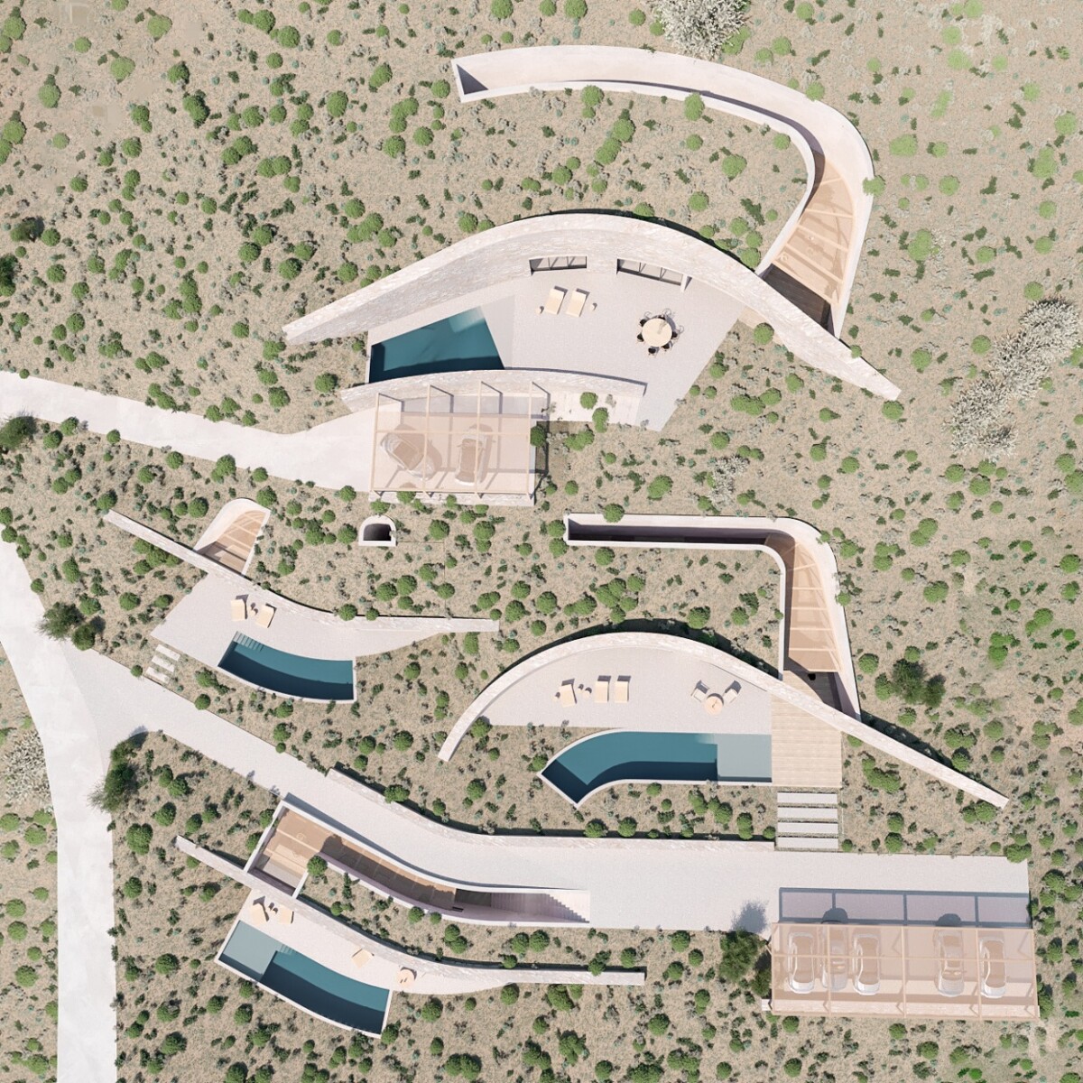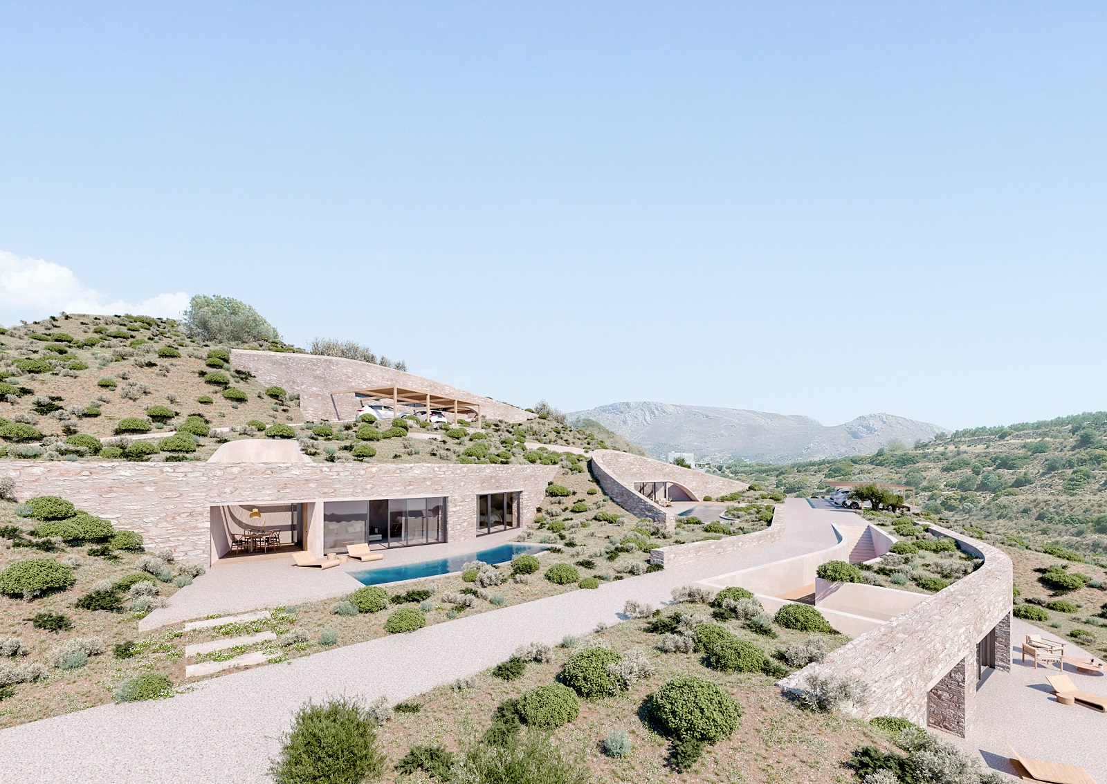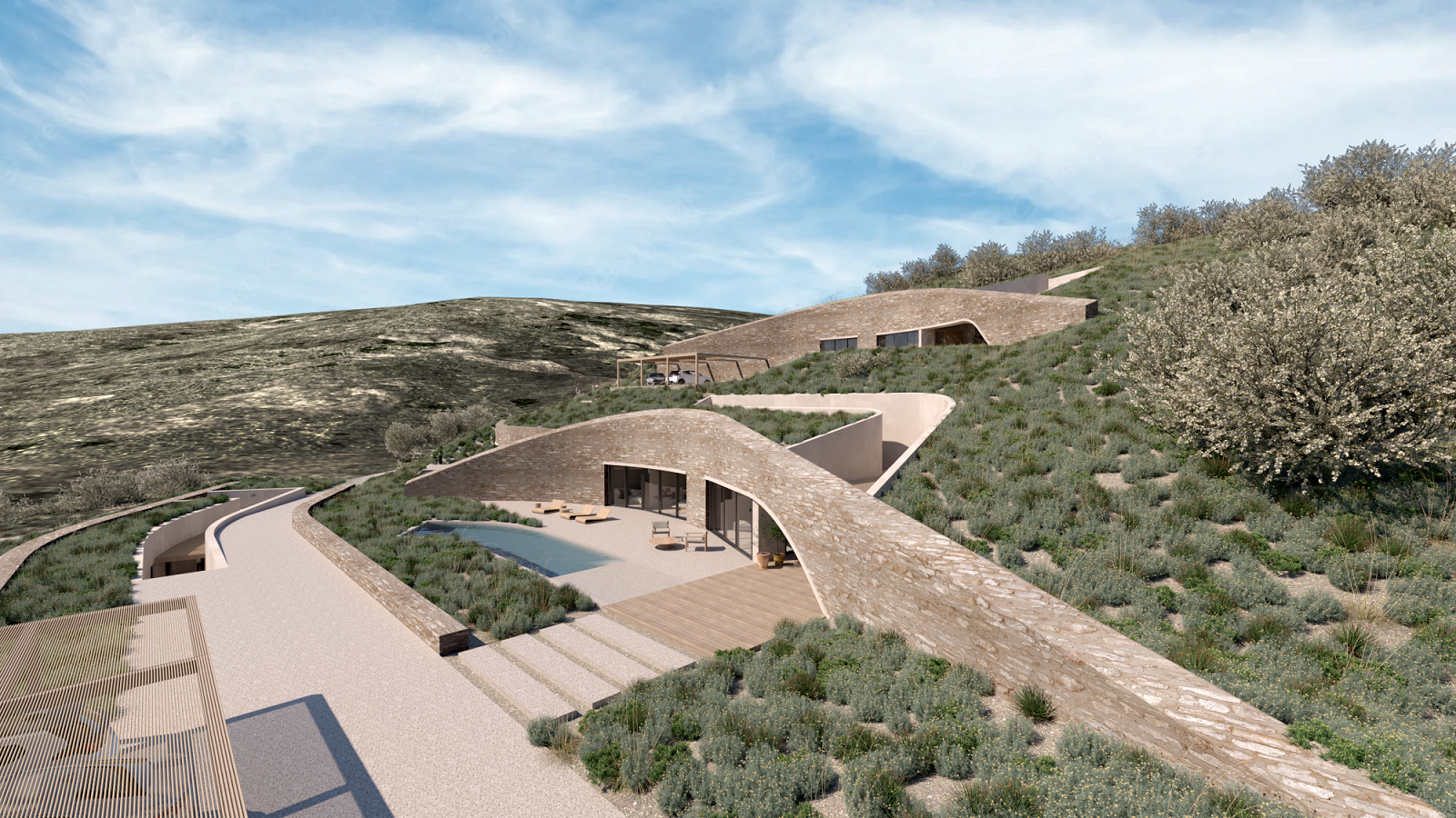 English description: The following project “Kýmata”, designed by architecture office Tzagkarakis + Associates, is a compound of four undercut residences in southern Crete. The particular geomorphology, the steep slope, the view to the bay of Messara and the colors of the landscape were the parameters that determined architect’s approach to the design of this plot.
