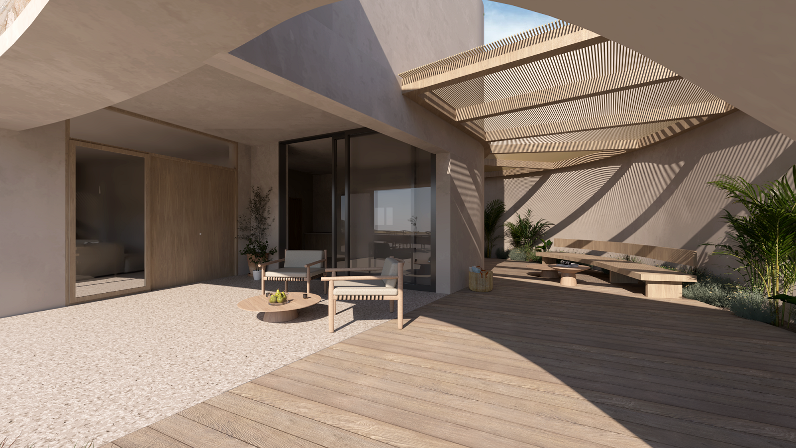 The entire compound faces the view, and the curves are shaped so that there is privacy between the individual residences. The compound conveysa sense of movement, created partly by the changing light throughout the day and partly by the different views of the buildings that the viewer may have from within the plot.