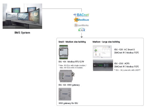 Ένα κρίσιμο χαρακτηριστικό του Multi V i είναι η πλήρης διασύνδεσή του με συστήματα BMS (BuildingManagementSystems) μέσω ανοιχτών πρωτοκόλλων όπως BACnet, Modbus & KNX.Αυτή η δυνατότητα επιτρέπει την ενσωμάτωσή του σε ετερογενή περιβάλλοντα αυτοματισμού, ανεξάρτητα από τον κατασκευαστή του BMS.