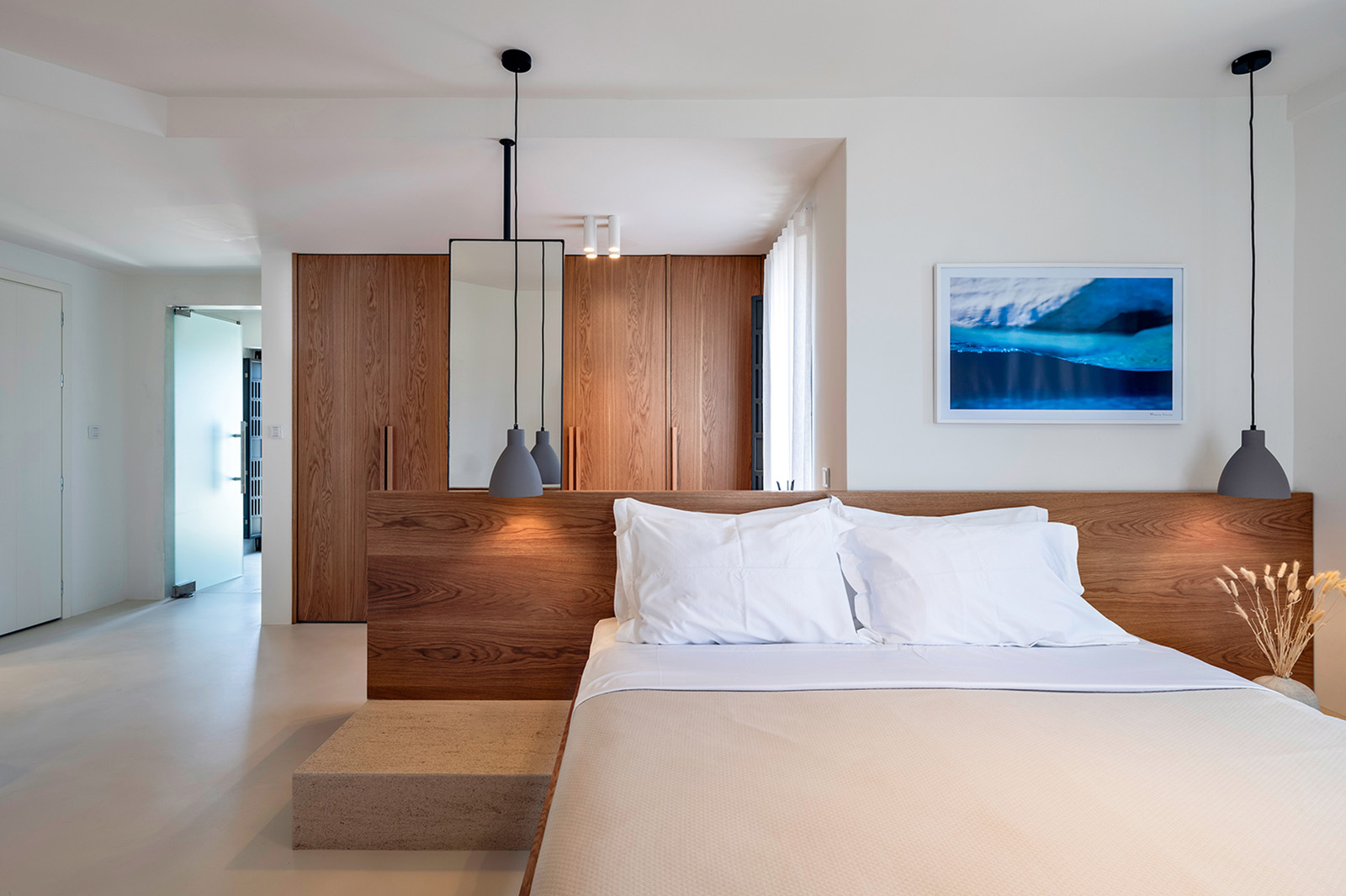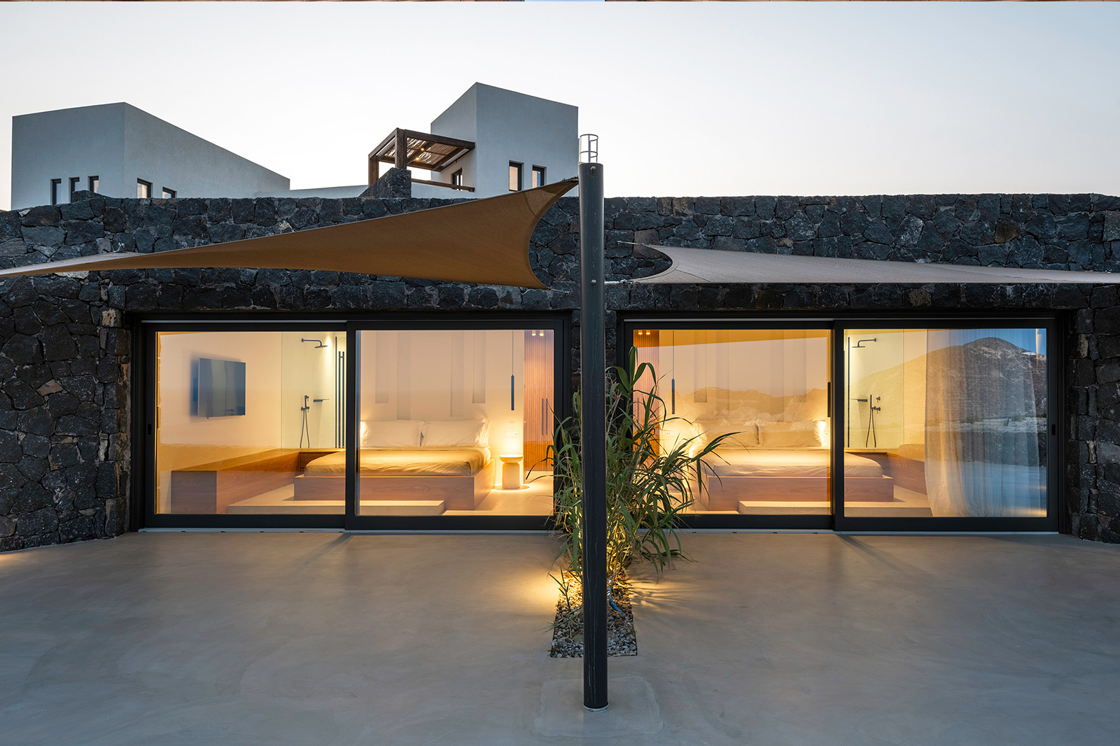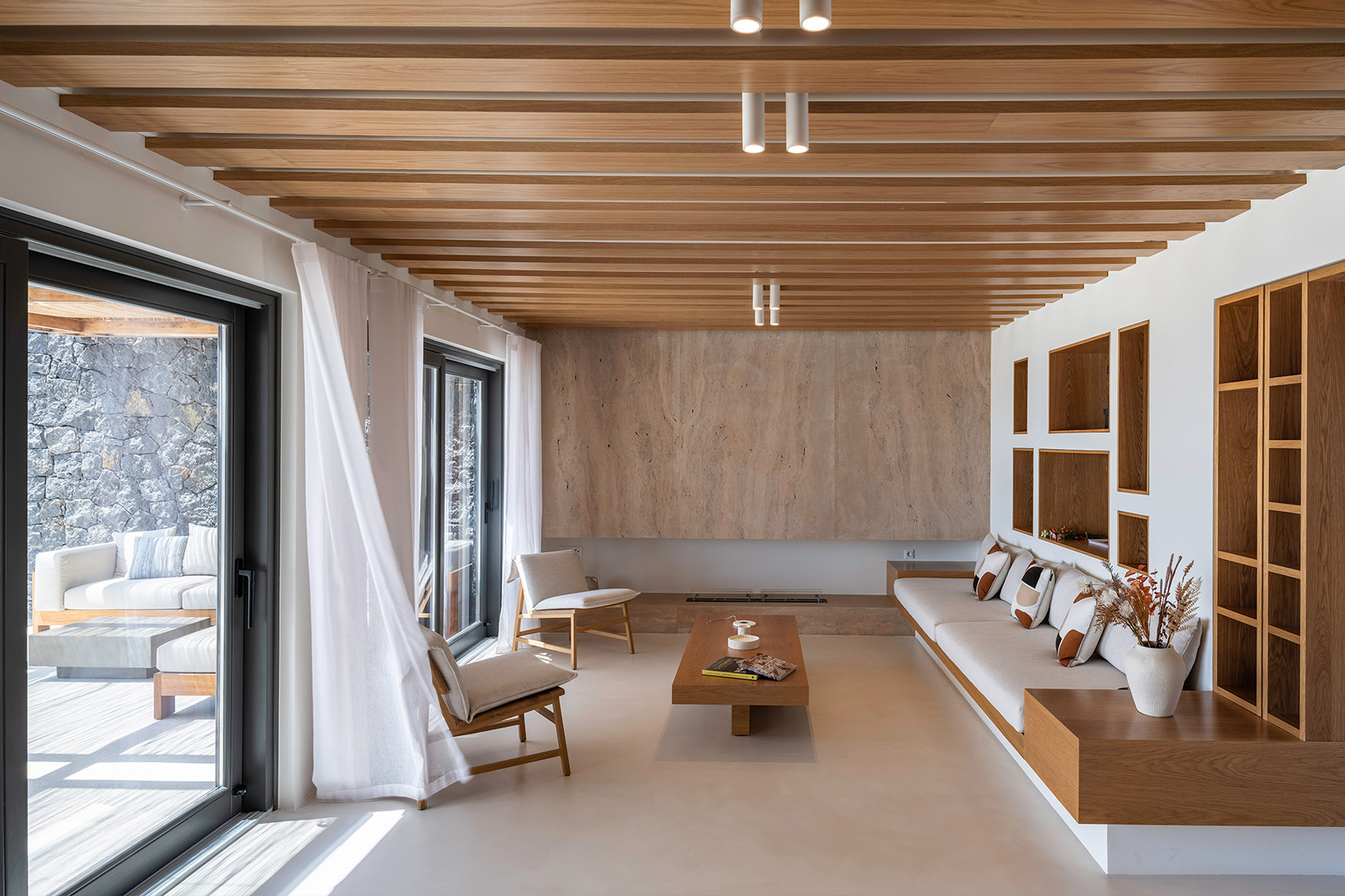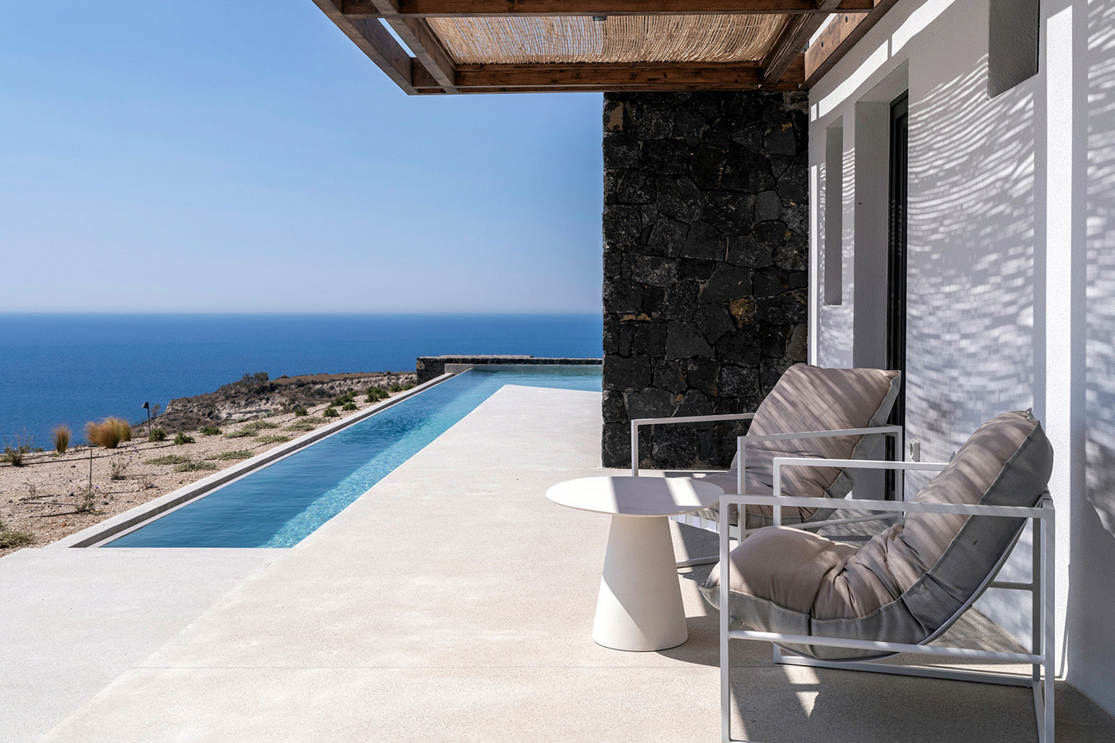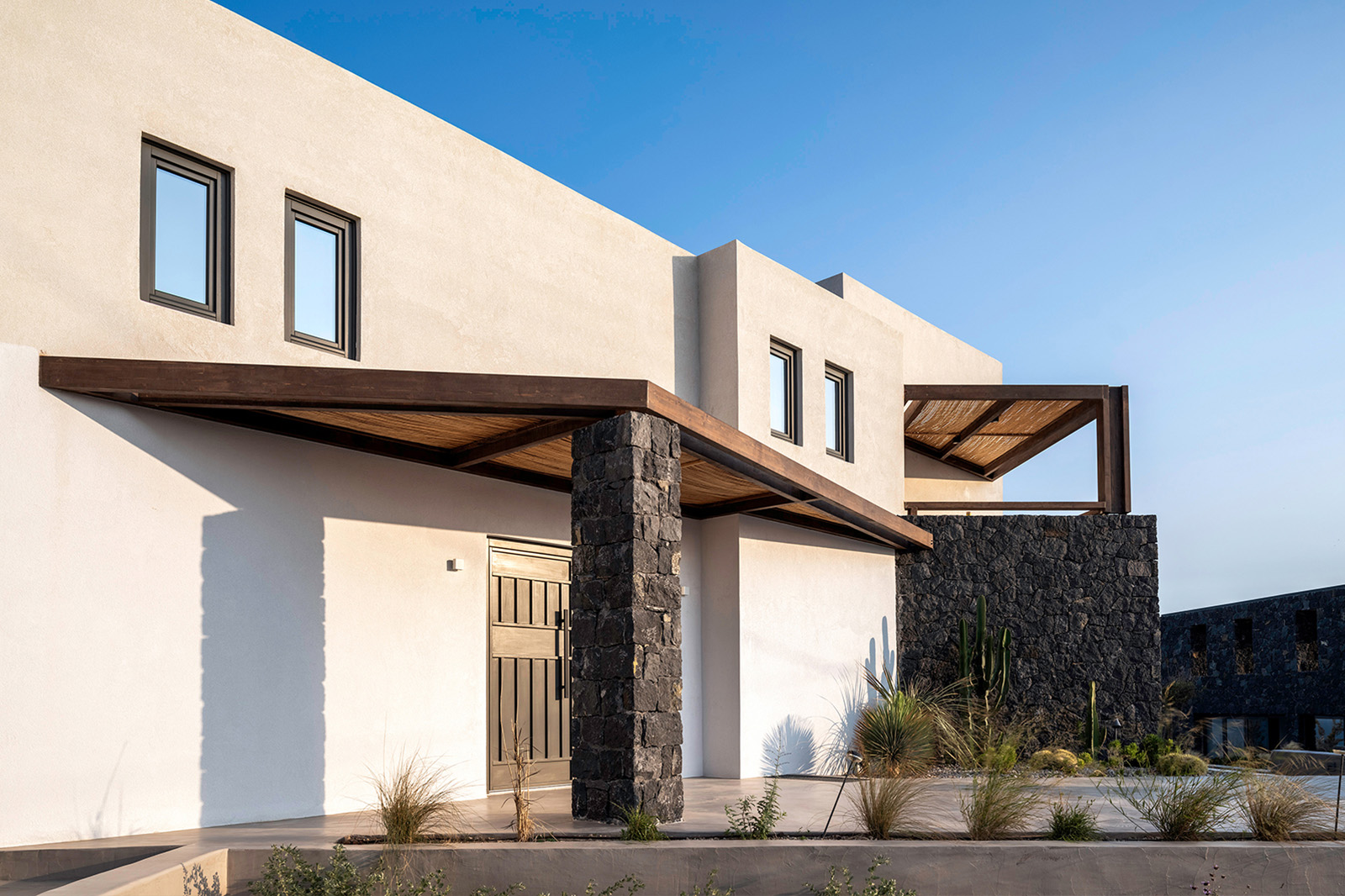 “Οι υλικές επιλογές είναι συγκρατημένες, με κυρίαρχα τη λευκή επιφάνεια και την τοπική πέτρα. Το ξύλο εμφανίζεται διακριτικά, προσθέτοντας αίσθηση ακρίβειας, χωρίς να υπαγορεύει ύφος. Η χρωματική παλέτα προκύπτει από το περιβάλλον: αποχρώσεις του μπεζ που παραπέμπουν στον ασβεστόλιθο, απαλό ροζ από τη στάχτη, και το έντονο λευκό που χαρακτηρίζει τον κυκλαδίτικο οικισμό”.