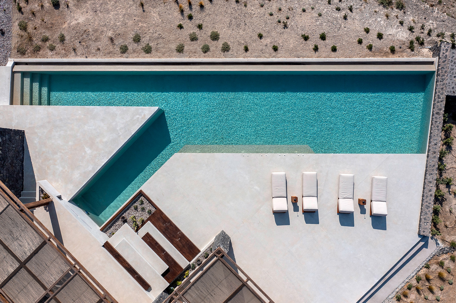 The architecture extends into the landscape sectionally. What was once a generic flat rooftop becomes a structured outdoor terrain. The guesthouses, conceived as modern hypóskapha, are embedded into the volcanic slope, referencing Cycladic tradition without relying on nostalgia. The result is a residence that is not decorative, but deliberate, layered, integrated, and in conversation with both site and structure.