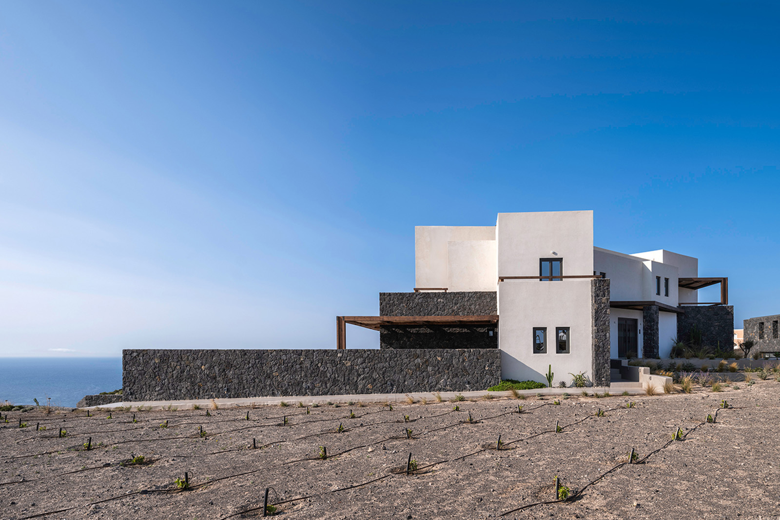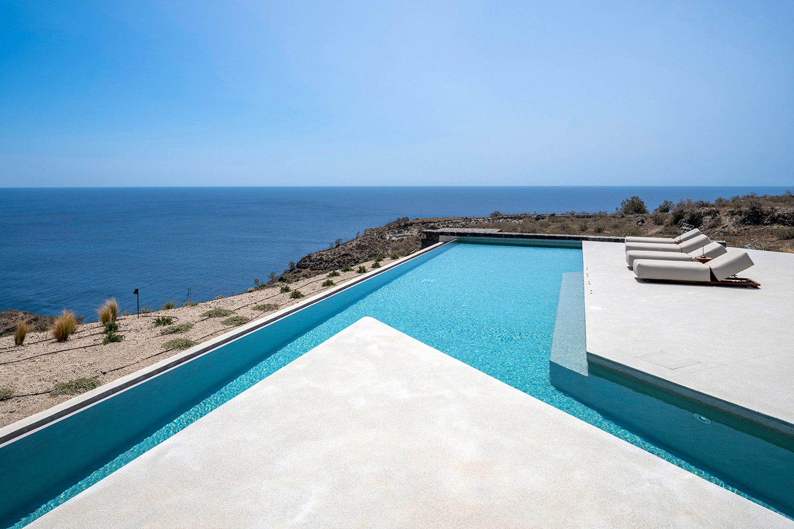 “At the center of the composition sits a linear pool. Positioned with a deliberate offset, it aligns the interior axes with the horizon and reconciles prior asymmetries in plan. It also functions as a spatial bridge, connecting the domestic interior with the volcanic landscape beyond. Around it, a subtle outdoor topography unfolds: open-air cinema, shaded seating, and a barbecue zone are seamlessly integrated across stepped levels”.