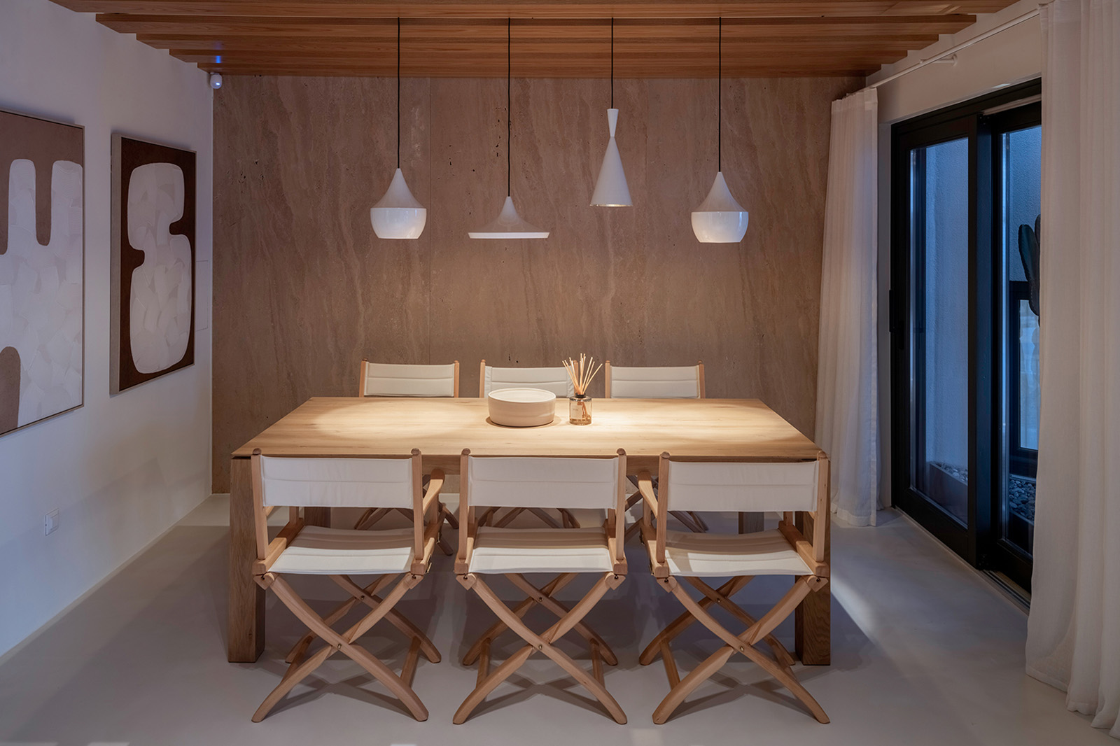 Στο εσωτερικό, η τοπική παράδοση φιλτράρεται μέσα από μια σύγχρονη και λειτουργική προσέγγιση. Η μεταλλική διάτρητη σκάλα και η γέφυρα εισάγουν φως και κατακόρυφη κίνηση, παραπέμποντας σε ναυτικές κατασκευές. Τα έπιπλα είναι σχεδιασμένα ή επιλεγμένα με ακρίβεια: τραπέζι από μάρμαρο Βολάκα, εντοιχισμένα ράφια, χειροποίητα κρεβάτια, επιλεγμένα φωτιστικά όπως αυτά του Tom Dixon και καθίσματα Fishbone, τοποθετημένα όχι για να δηλώσουν ύφος, αλλά για να εξυπηρετήσουν με διακριτικότητα τον χώρο.