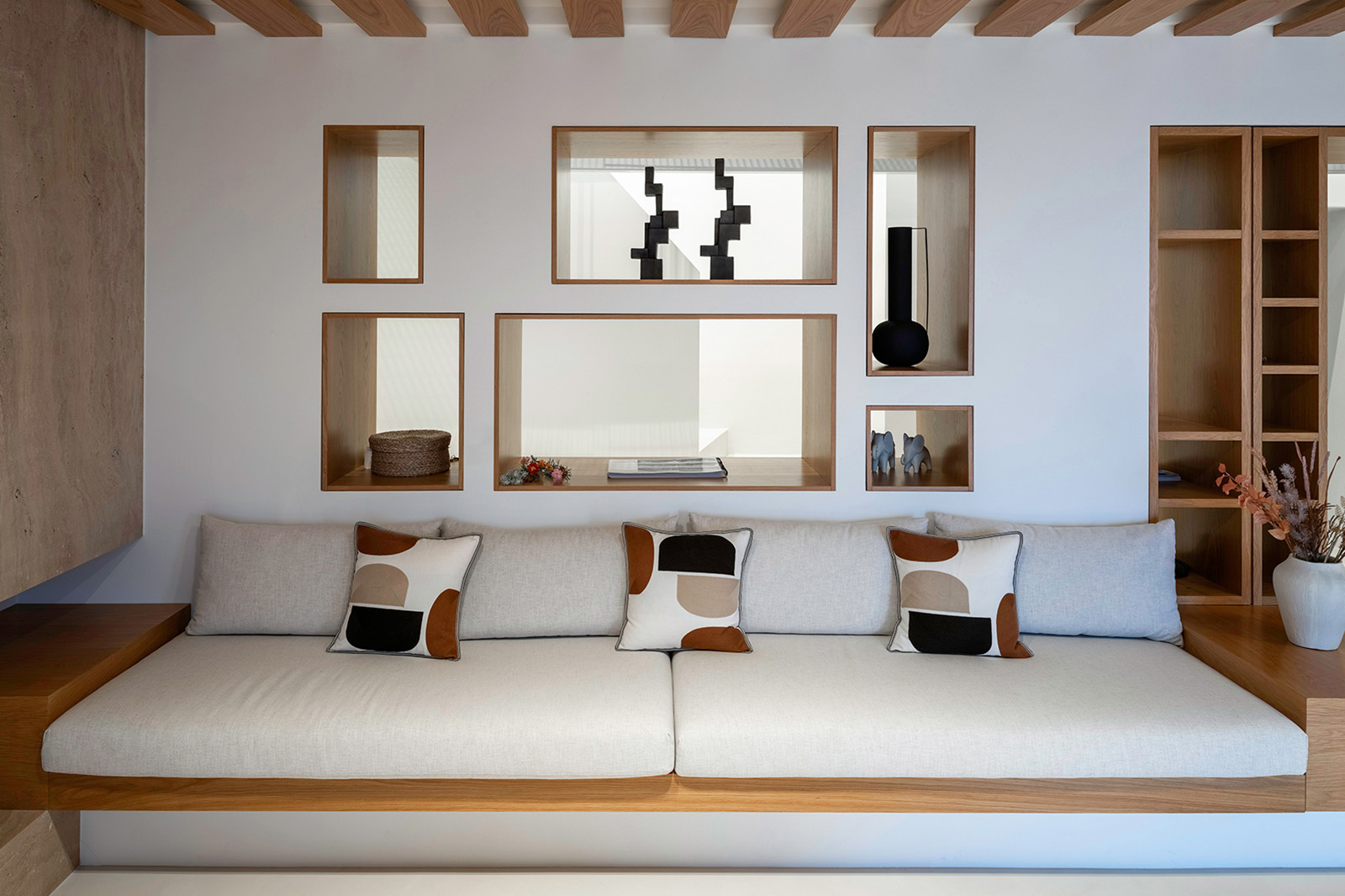Inside, spatial openness is maintained through varied sightlines and discreet zoning. Functional areas are loosely defined rather than closed off. Bespoke joinery, built-in shelving, Volakas marble elements, and hand-crafted beds form a coherent interior language, contemporary, site-specific, and quietly tactile.