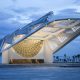 The space is flanked on both sides by waterfalls with the water element of the central staircase connected to the gates. In the interior, an organic environment is created that refers to elements of nature: shell pergolas that are transformed into wooden sculptural elements, combining with the illuminating membranes to create light sources.