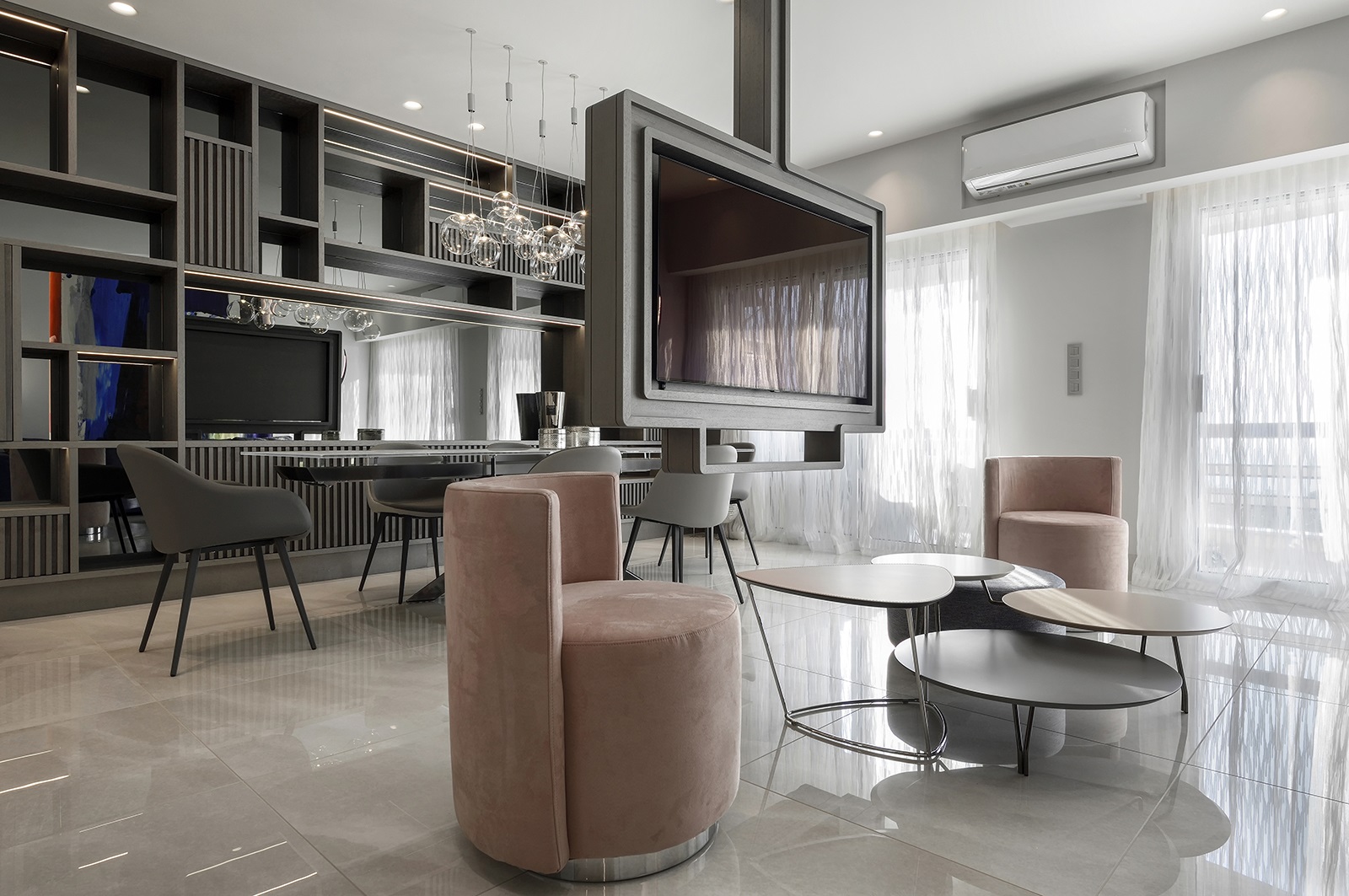 Ένα διαμέρισμα τυπικής πολυκατοικίας της δεκαετίας του ’60, που βρίσκεται στο παραλιακό μέτωπο της Θεσσαλονίκης, με υπέροχη θέα στον Θερμαϊκό κόλπο, ανασχεδιάστηκε από τον Απόστολο Παπαβασιλείου, αρχιτέκτονα μηχανικό και κάτοχο Master of Arts on Lighting design, υιοθετώντας μια σύγχρονη, μινιμαλιστική σχεδιαστική προσέγγιση, σε συνδυασμό με μια pop αίσθηση πολυτέλειας, που αντικατοπρίζεται από τις χαράξεις του αρχιτεκτονικού σχεδιασμού και από τις επιλογές των υλικών.