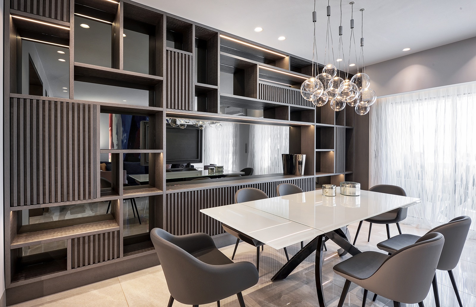 The lighting study also played a decisive role in the final result of the interior design, which in this project was an integral part of the architectural composition from its early stages, a fact that in many parts of the study includes the concept of artificial lighting with uniformity and playfulness, depending on the use and operation of each space within the apartment.