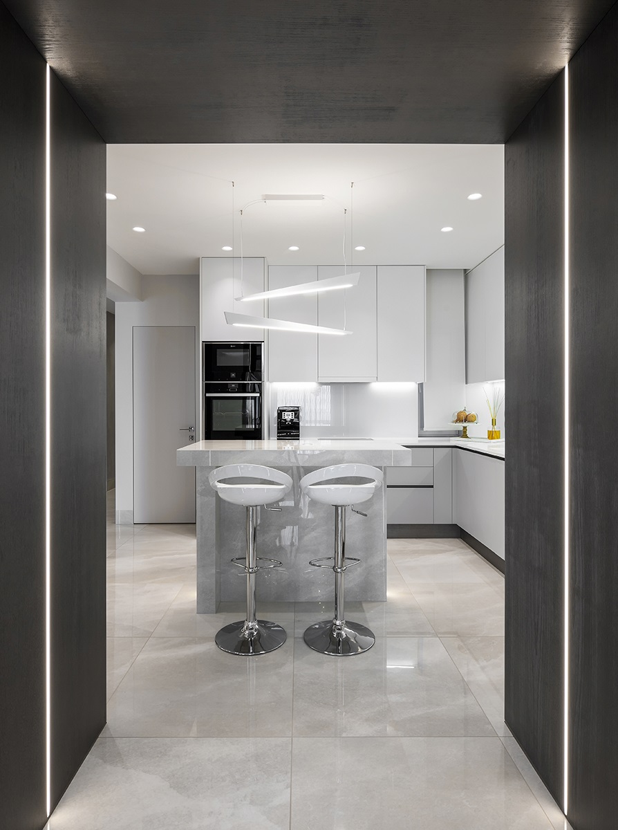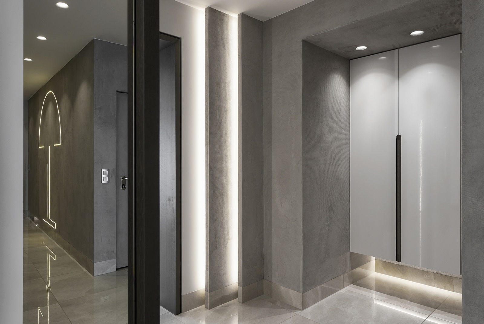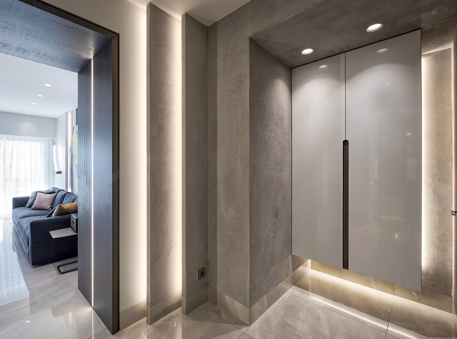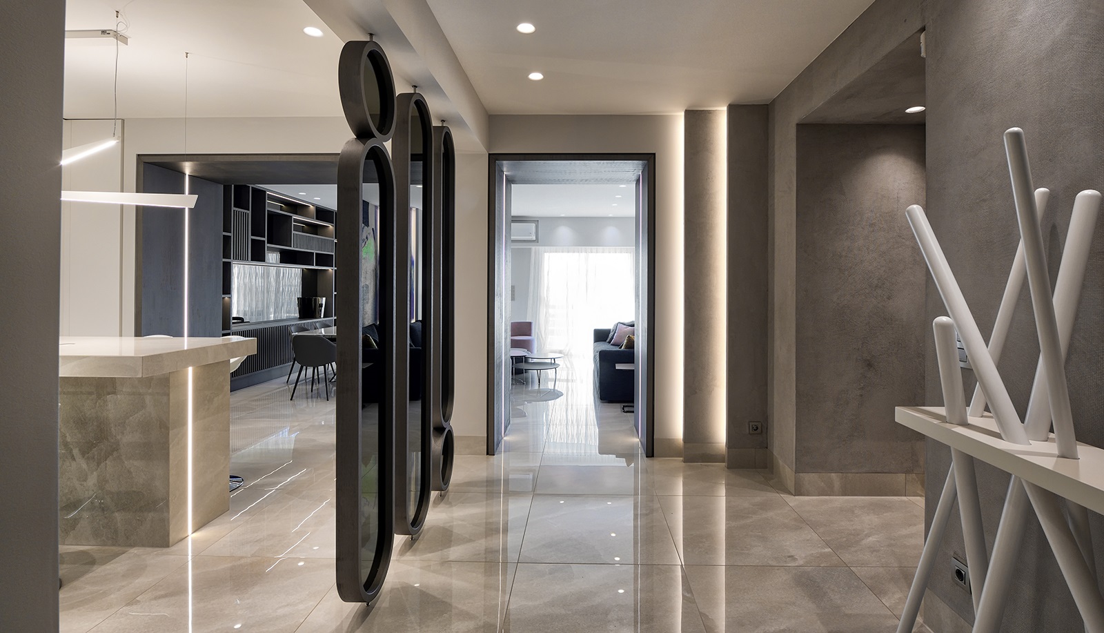 Καθοριστικό ρόλο επίσης στο τελικό αποτέλεσμα του interior design, έπαιξε η μελέτη φωτισμού, που στο συγκεκριμένο project αποτέλεσε αναπόσπαστο κομμάτι της αρχιτεκτονικής σύνθεσης από τα πρώτα στάδιά της, γεγόνος που σε πολλά σημεία της μελέτης, εντάσσεται η έννοια του τεχνητού φωτισμού με ομοιορφία και δυναμικότητα, ανάλογα με την χρήση και λειτουργία του κάθε χώρου εντός του διαμερίσματος.