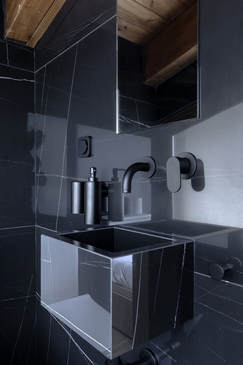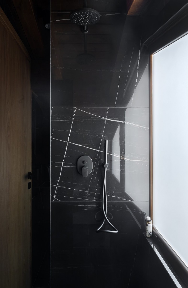 The wood dining table is customized by MK Design Studio to integrate with the wood floor and ceiling. Bathrooms are of dark grey marble subtly streaked with grey, and plumbing fixtures of contemporary design are of matte black steel.