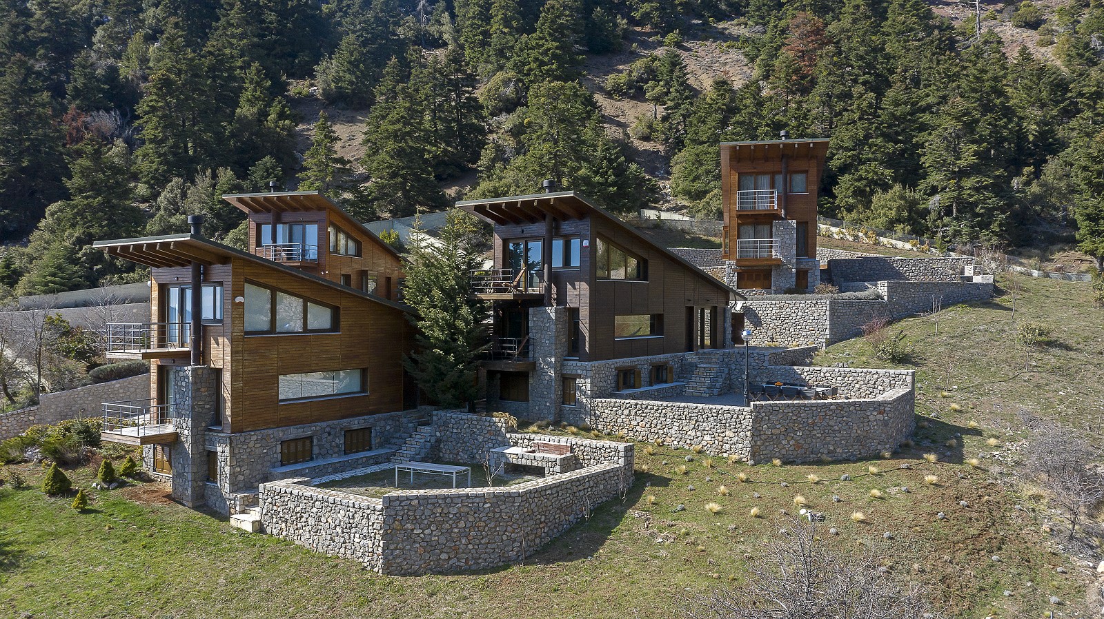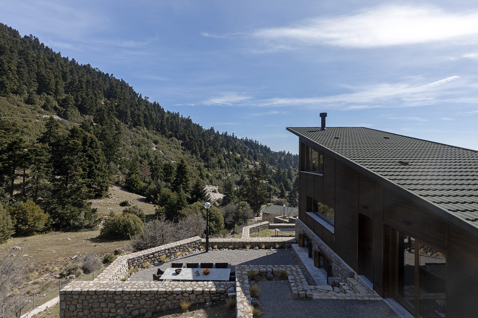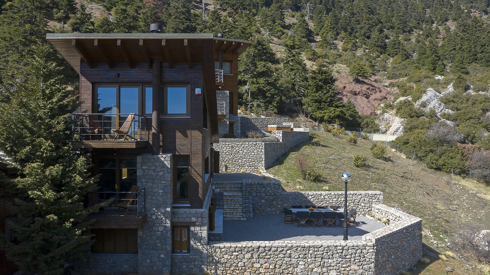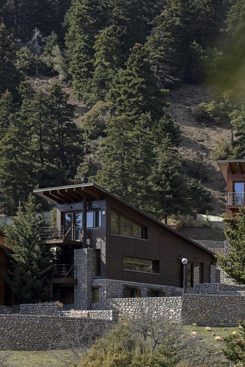 The building is one of a group of small, environmentally responsible 3-story vacation homes designed by Evagelos & Panos Chatzis, situated at an altitude of 980m on the slopes of Mount Parnassus. It is located near a rocky stream and encircled by fir and chestnut trees.