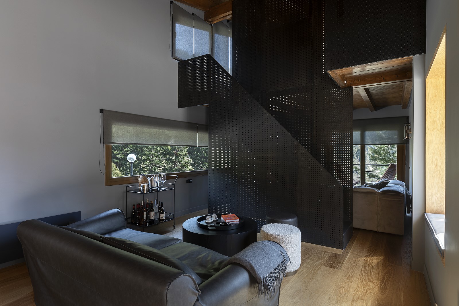 MK Design Studio (Maria Kardami Design Studio) has created an interior inspired by the surrounding landscape and the structure’s exterior of local stone and native timber cladding. The resulting living spaces have a contemporary quality which harmonizes man-made structural elements with nature while avoiding the cliché of mountain rusticity.