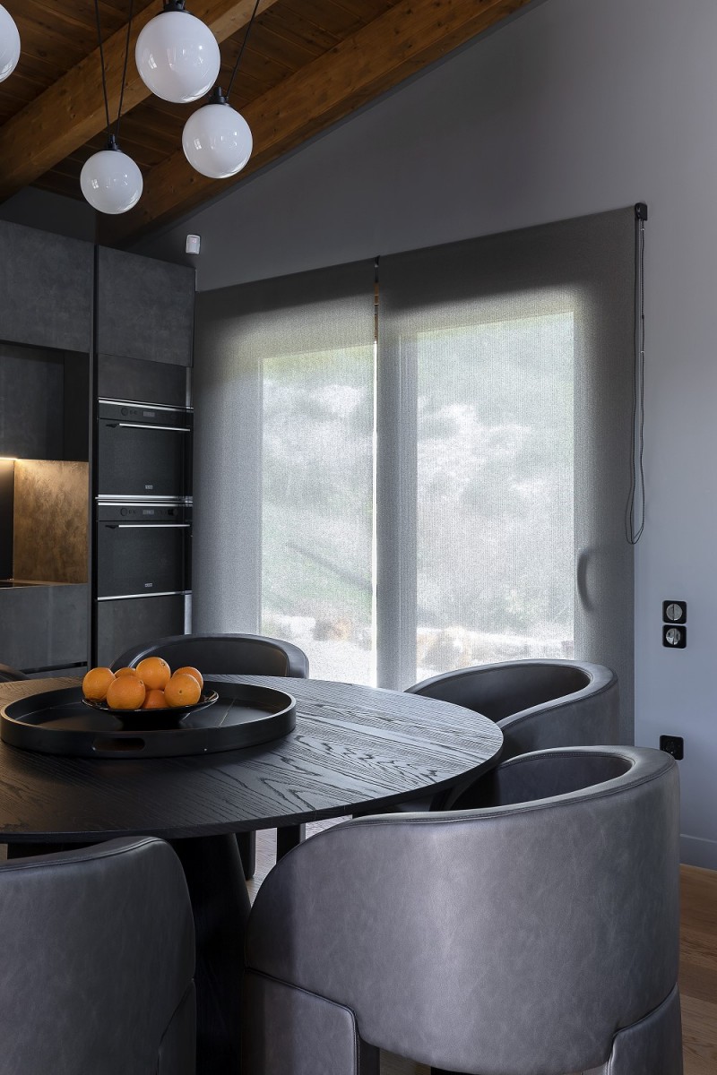 “The elegantly minimalist kitchen is finished in the softly mottled colour of blackened steel, matched by upholstered dining chairs by Baxter Furniture”.
