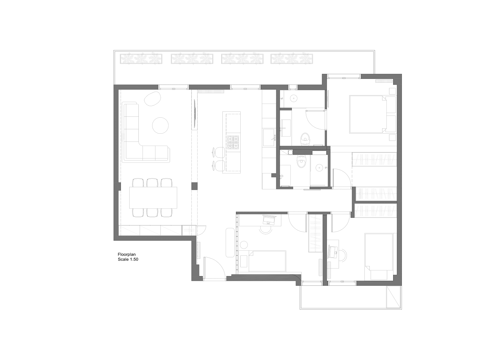 Διατηρώντας τις περισσότερες εσωτερικές τοιχοποιίες μεταφέρθηκε λειτουργικά η κουζίνα και ενωποιήθηκε με το καθιστικό σε μία openplan διάταξη, ενώ στη θέση της σχεδιάστηκε ένα δωμάτιο με κυρίως χρήση γραφείου ή ξενώνα, το οποίο όμως επικοινωνεί με την είσοδο του διαμερίσματος μέσω ενός εσωτερικού ξύλινου κουφώματος. Οι υπόλοιποι χώροι παρέμειναν στην αρχική τους διάταξη με εξαίρεση το δεύτερο λουτρό το οποίο ενσωματώθηκε στο masterbedroom μαζί με ένα χώρο βεστιαρίου.
