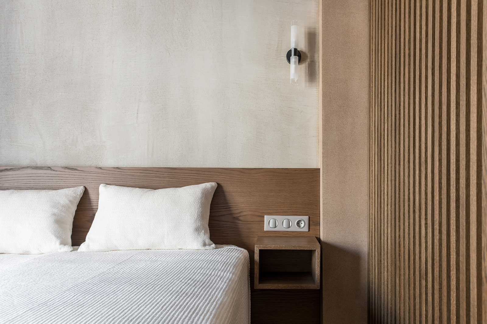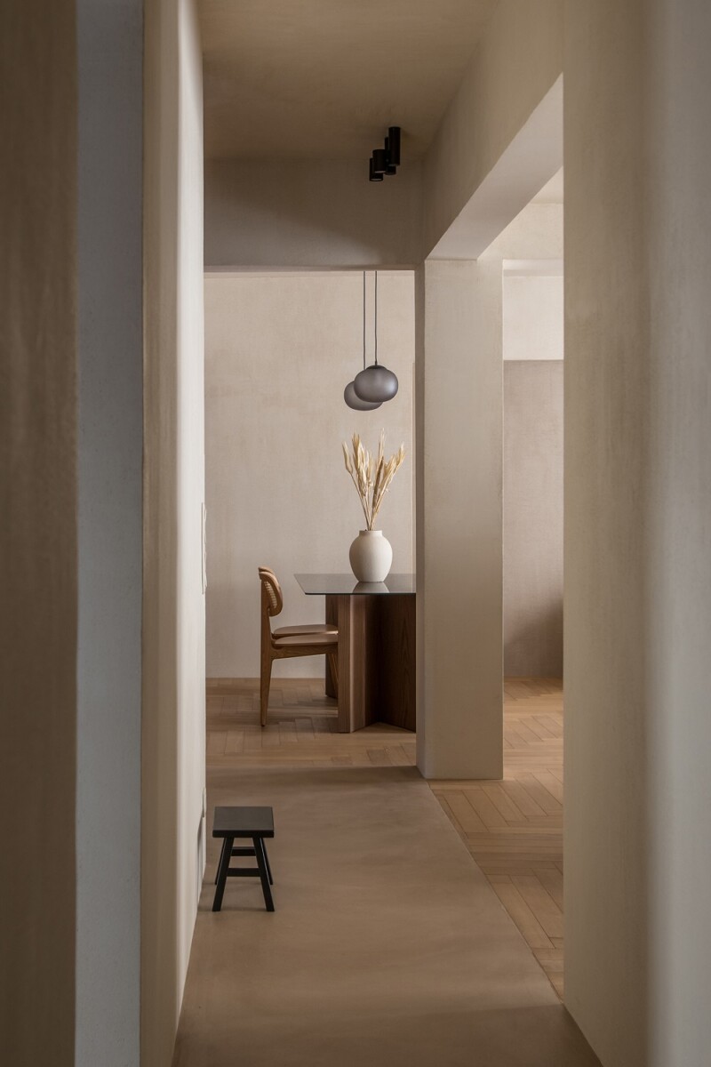 Η εφαρμογή του κονιάματος επάλειψης σε φυσικούς γήινους τόνους στα περισσότερα δάπεδα, στις τοιχοποιίες, στις πόρτες αλλά και στις οροφές προσδίδει έναν ιδιαίτερο χαρακτήρα, ομογενοποιεί τους χώρους και τονίζει τις ξύλινες κατασκευές του διαμερισματος. Λειτουργώντας ως διαφυγή από την ίδια την πόλη, το διαμέρισμα προσφέρει μια αίσθηση ηρεμίαςμακριά από το βουητό των δρόμων.