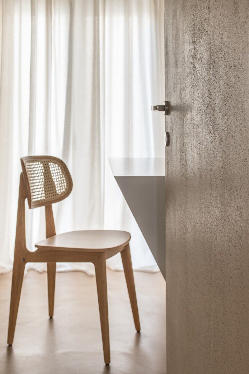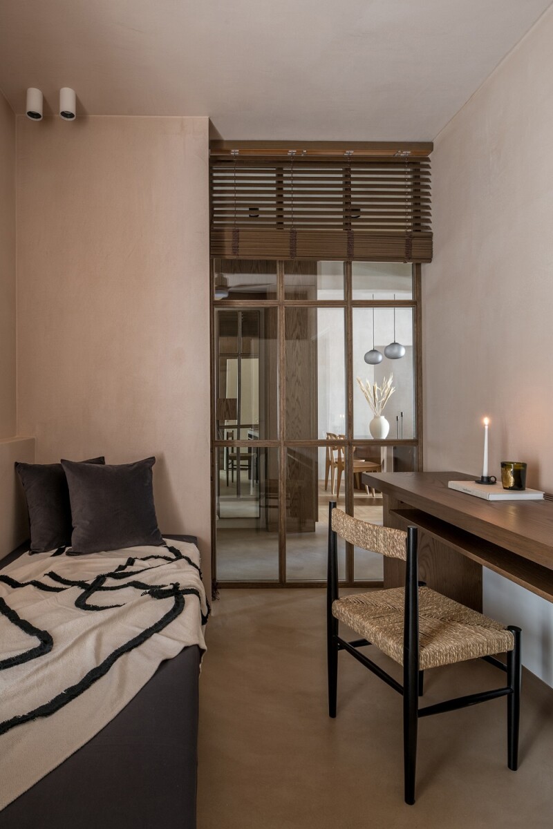 The application of the mortar in natural earth tones on most floors, masonry, doors and ceilings gives a special character, homogenizes the spaces and emphasizes the wooden constructions of the apartment. Acting as an escape from the city itself, the apartment offers a sense of calm away from the hustle and bustle of the streets.