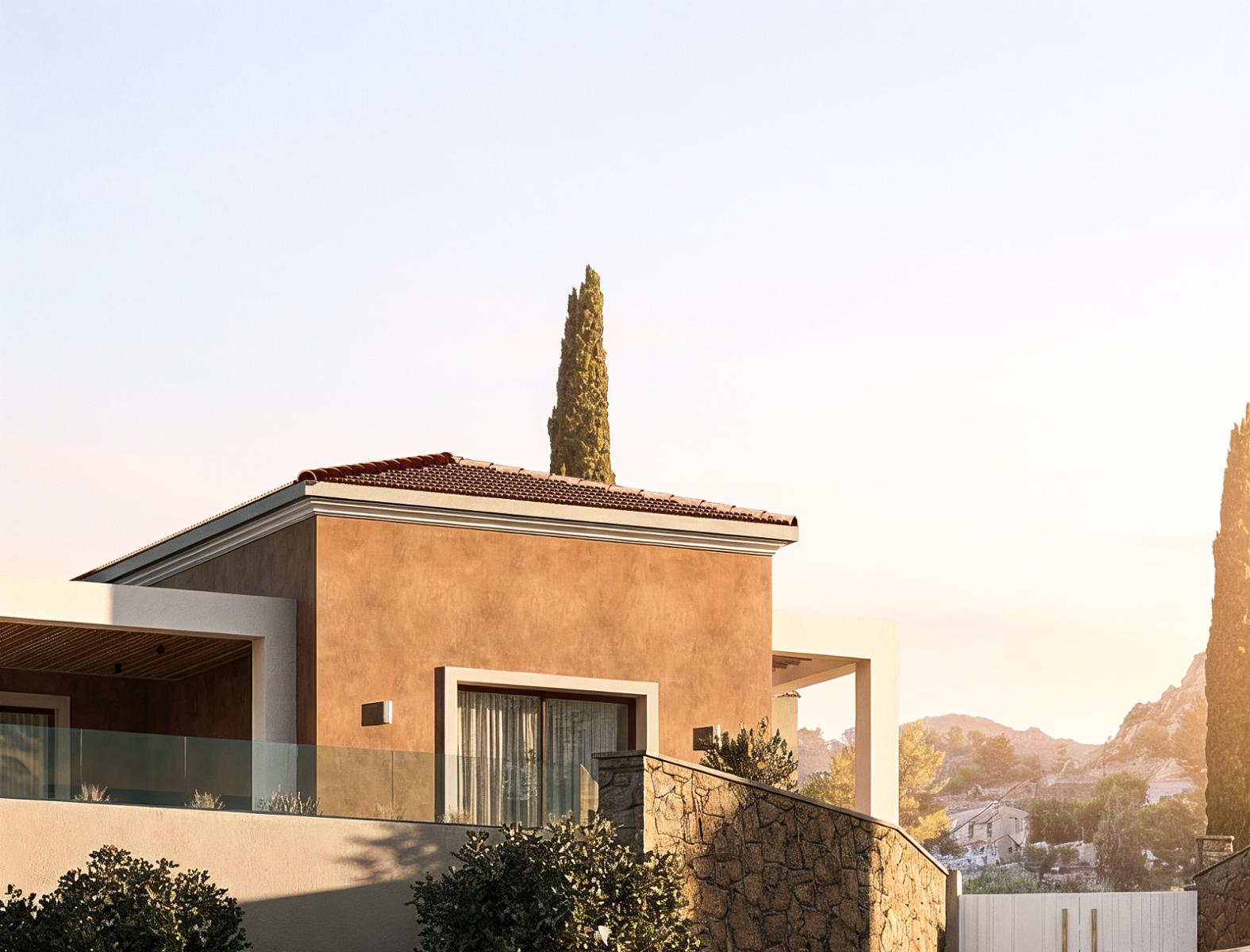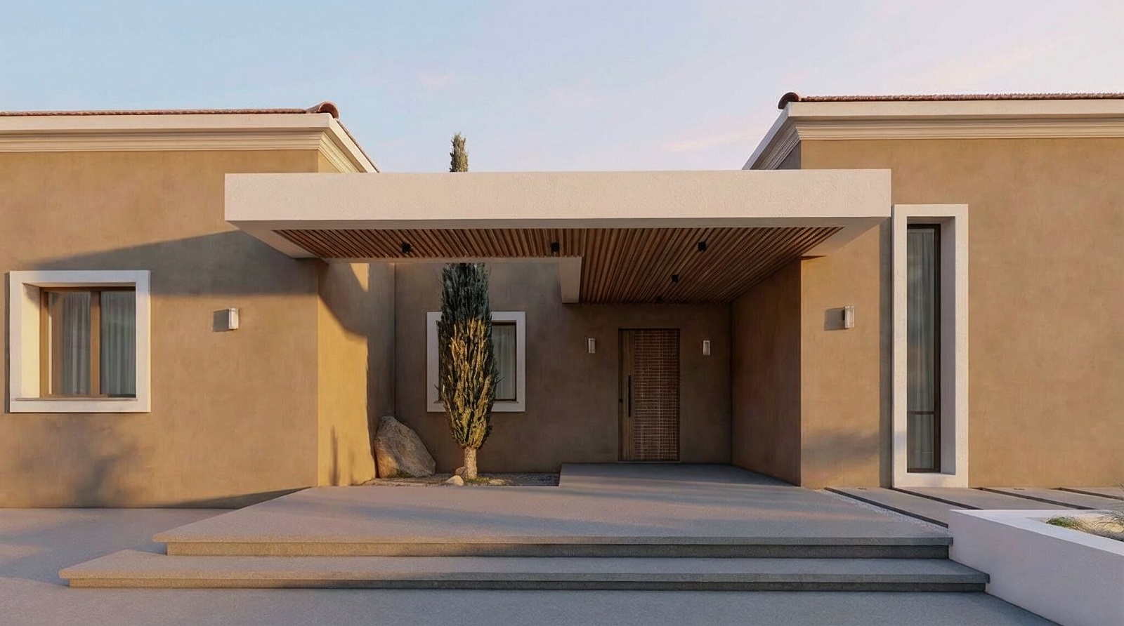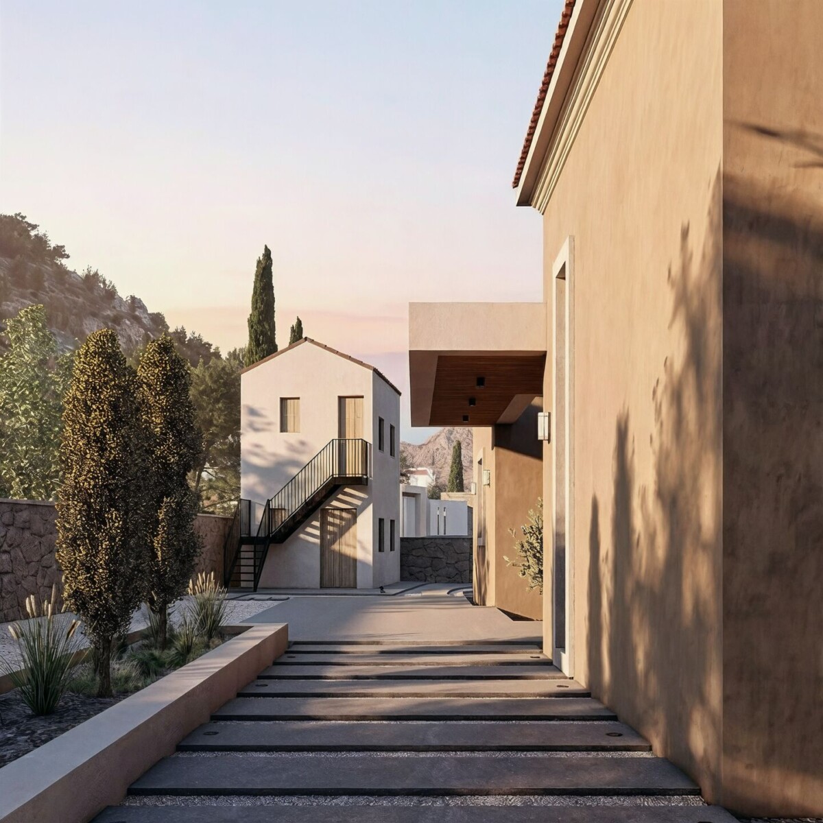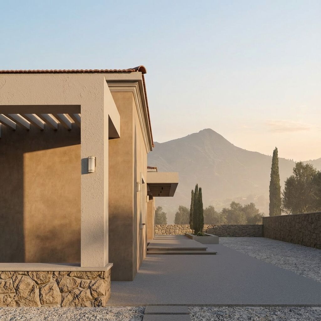 At the northwest corner of the plot, the existing traditional two-storey building served as a strong reference point. The new residence gently turns toward it, while the linear path leading to the entrance highlights the relationship between old and new. Earthy tones, wooden window frames, and white details complete an architectural approach that respects both the landscape and the traditional character of the area.