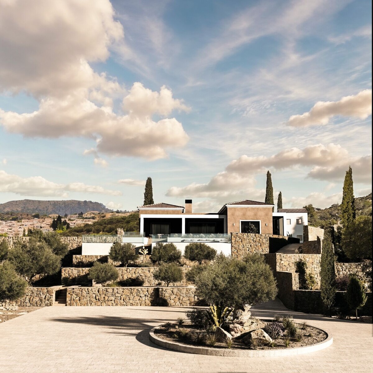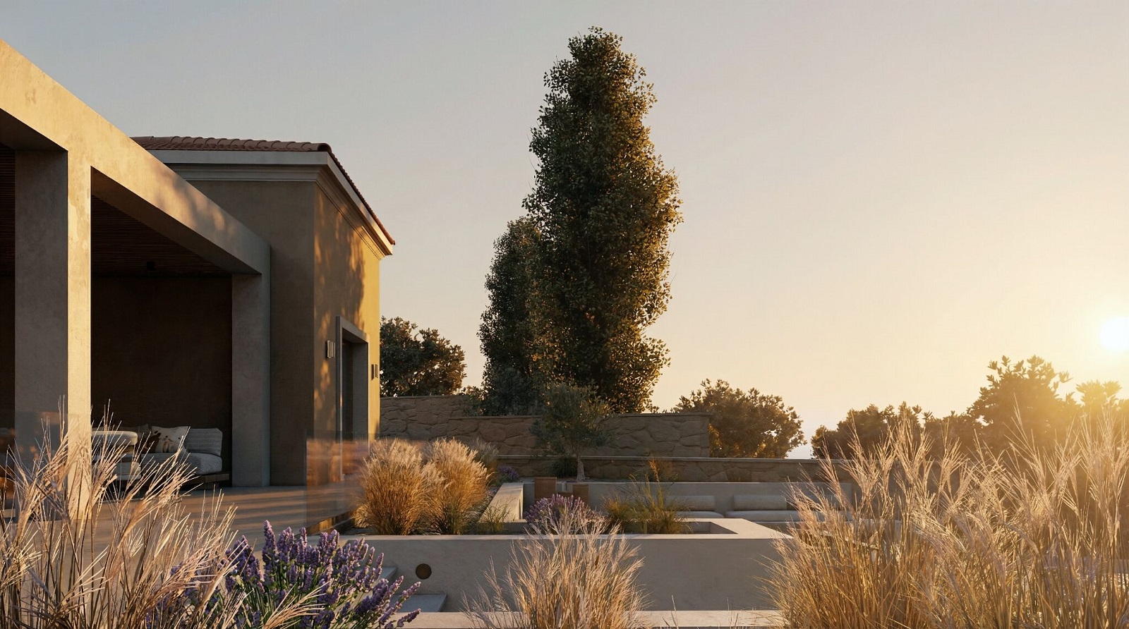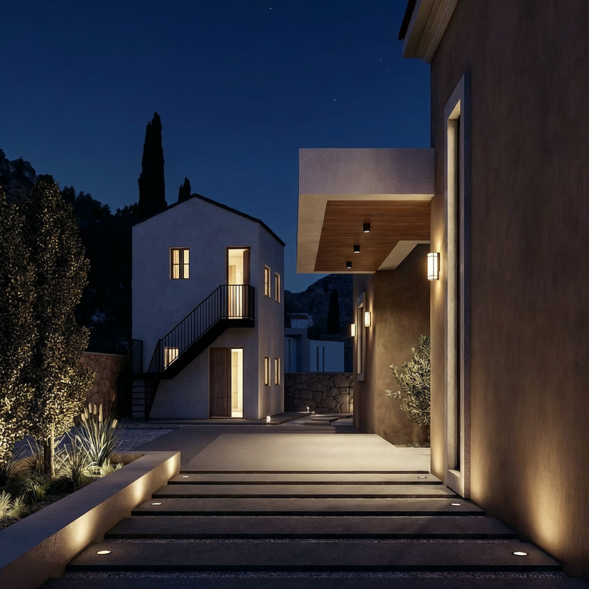 At the northwest corner of the plot, the existing traditional two-storey building served as a strong reference point. The new residence gently turns toward it, while the linear path leading to the entrance highlights the relationship between old and new. Earthy tones, wooden window frames, and white details complete an architectural approach that respects both the landscape and the traditional character of the area.