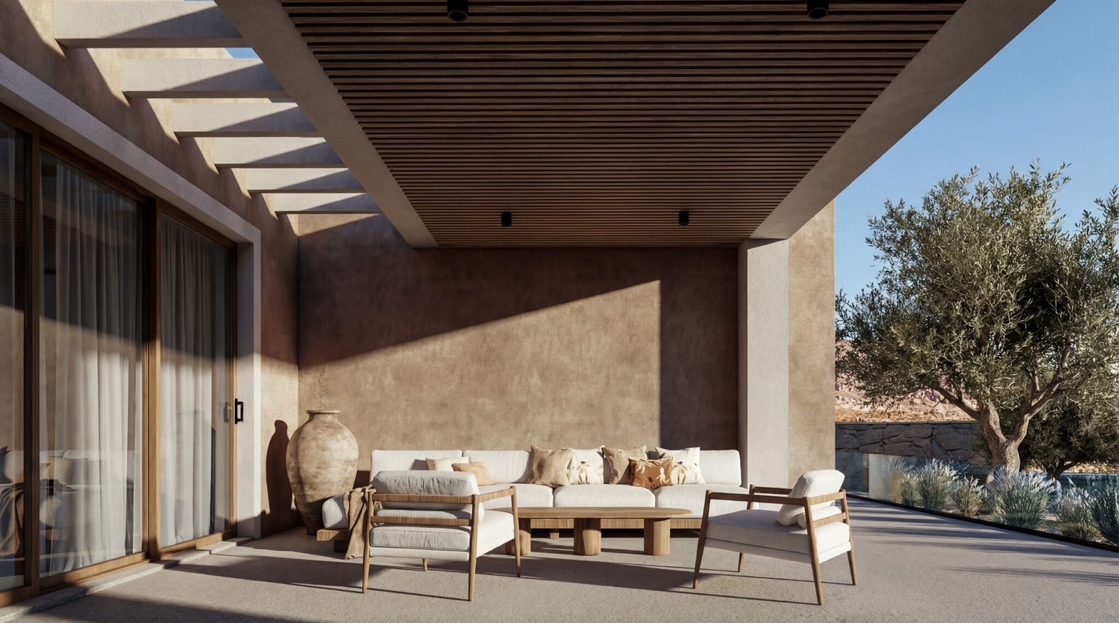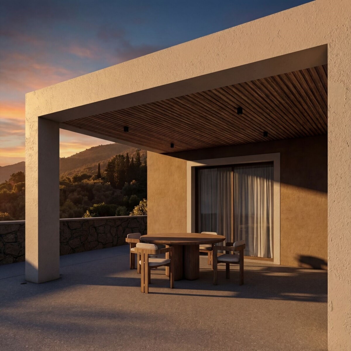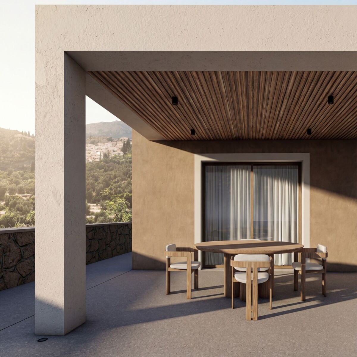 The northern semi-outdoor area acts as a sheltered zone that leads toward the eastern terrace, the main outdoor living area. In front of this terrace, an outdoor seating space is placed at a lower level to follow the natural ground. The stone retaining walls, built with local stone, form the “plinth” of the house and guide the view and movement toward the olive grove.