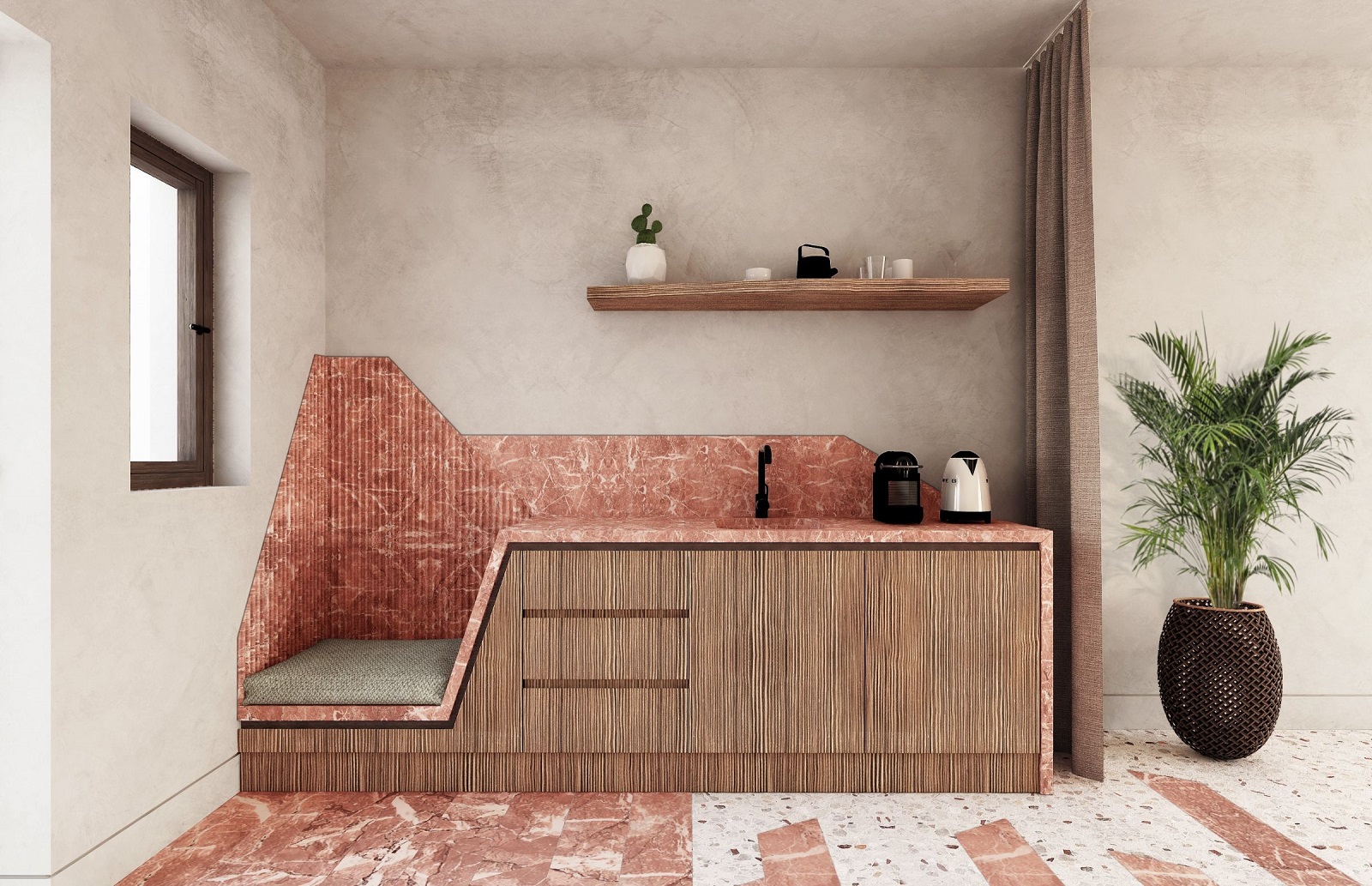 Η ιδιαίτερη αισθητική και η μοναδική ιστορία του νησιού έχουν δώσει μορφή στο NOŪS. Είναι οι διάσημες τοιχογραφίες στο Ακρωτήρι της Σαντορίνης που όρισαν την χρωματική παλέτα του resort. Οι γήινες αποχρώσεις της τερακότας, τα ζωντανά θερμά χρώματα τους «βάφουν» τα δωμάτια και τους κοινόχρηστους χώρους. Η περίφημη «κουλούρα» – ο χαρακτηριστικός τρόπος πλέξης των αμπελιών που είναι μοναδικός στο νησί – είναι παρούσα με νέο τρόπο σε σημαντικά στοιχεία της διακόσμησης.