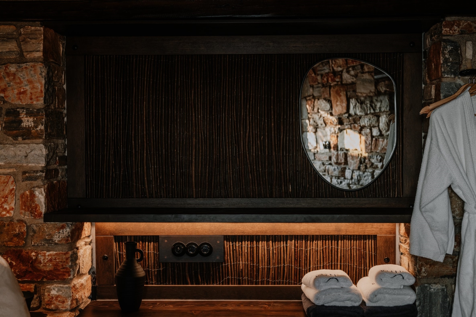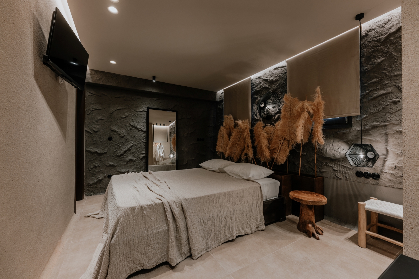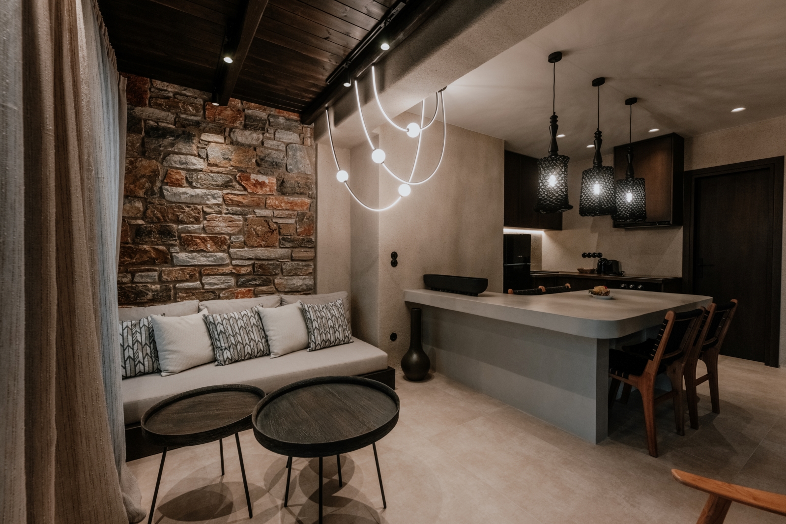 Επιλέχθηκαν φωτιστικά που υποστηρίζουν τη γεωμετρία και τους όγκους χωρίς να κυριαρχούν. Κρυφοί φωτισμοί LED και κρεμαστά φωτιστικά στα υπνοδωμάτια αναδεικνύουν τις υφές και δημιουργούν μια ήρεμη, χαλαρωτική ατμόσφαιρα ιδανική για ξεκούραση. Σε επιλεγμένα σημεία τοποθετήθηκαν διακοσμητικά φωτιστικά με κεραμικές, μεταλλικές και πλεκτές λεπτομέρειες, προσδίδοντας μια οργανική, χειροποίητη αίσθηση που συνδέεται με το κυκλαδίτικο περιβάλλον. Στους εξωτερικούς χώρους, ο φωτισμός οργανώνεται με φωτιστικά χαμηλής έντασης και αντοχής σε υγρασία, ώστε να διασφαλίζεται η ορατότητα αλλά να διατηρείται η ατμόσφαιρα χαμηλού φωτισμού που χαρακτηρίζει τη νυχτερινή νησιωτική εμπειρία.