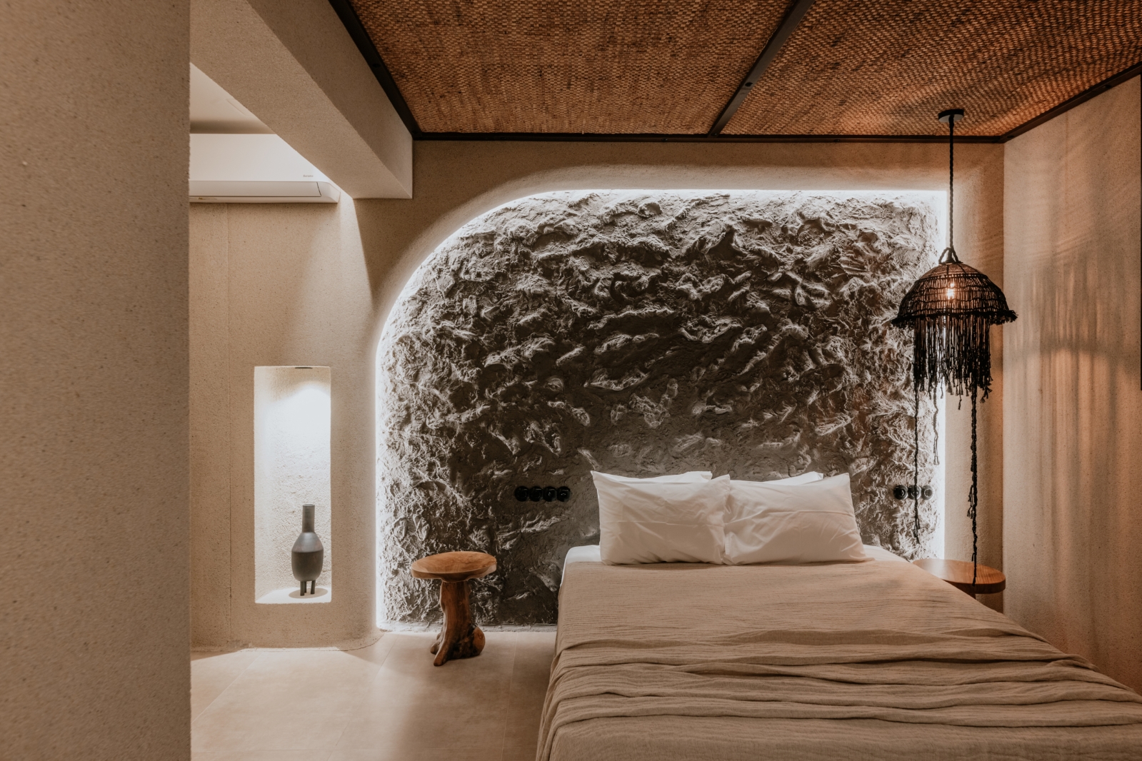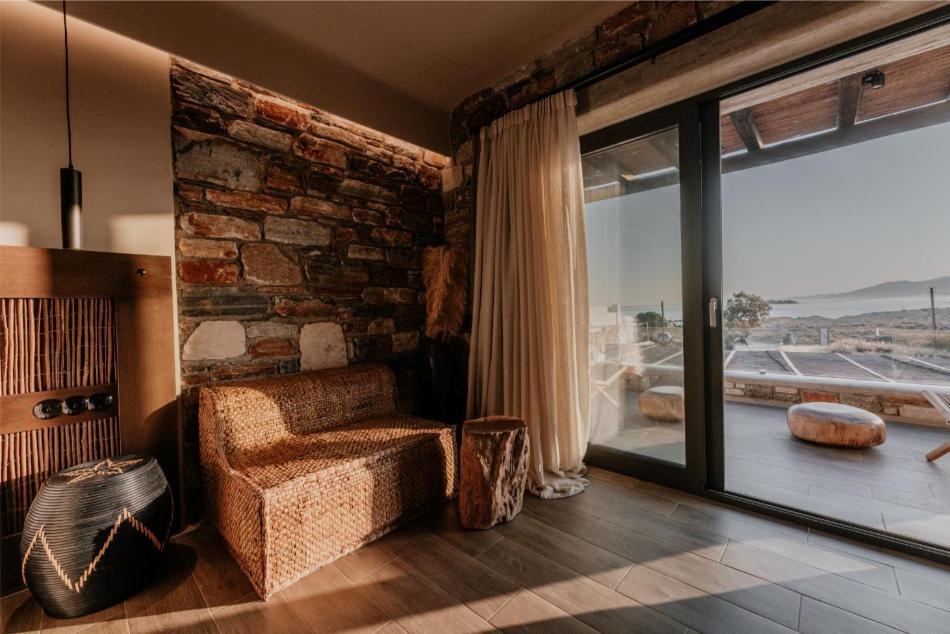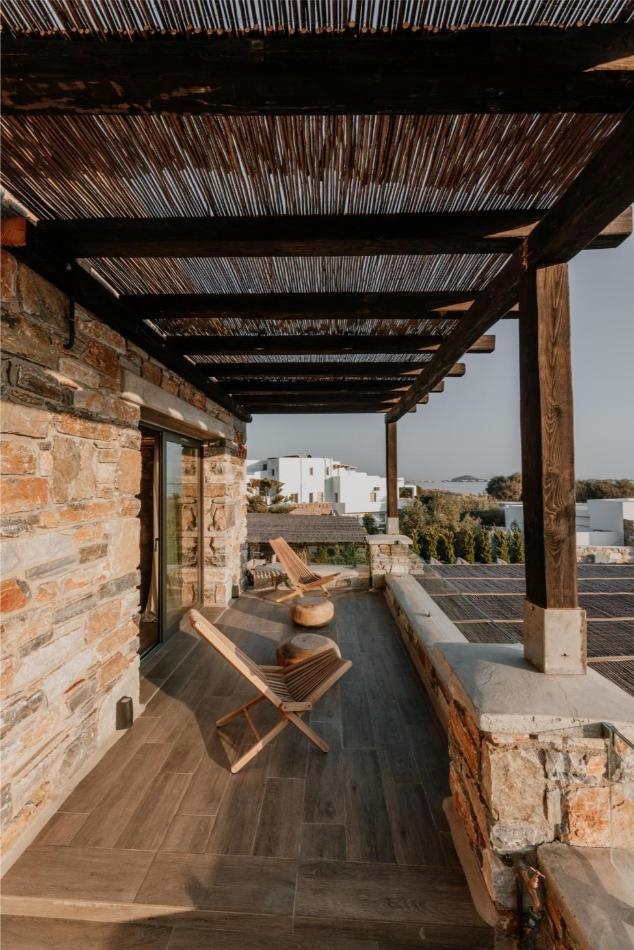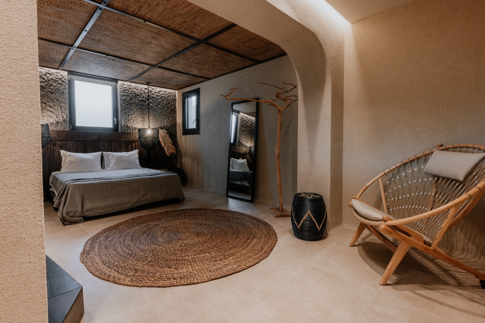 Λεπτές υφασμάτινες επικαλύψεις σε γήινες αποχρώσεις σε συνδυασμό με διακοσμητικά καλάμια που δρουν ως φόντο στους χώρους διανυκτέρευσης, ολοκληρώνουν τη μεταφορά της αίθησης του εξωτερικού στον εσωτερικό χώρο. Οι εξωτερικοί χώροι των κατοικιών διαχωρίζονται με στοιχεία φύτευσης και κλωστρά, τα οποιά αποτελούν χαρακτηριστικό στοιχείο της αρχιτεκτονικής του νησιού και των Κυκλάδων εν γένει.