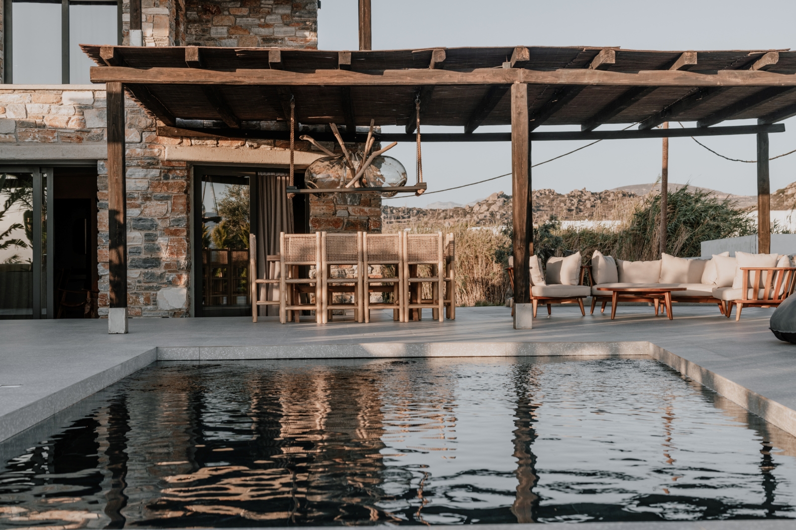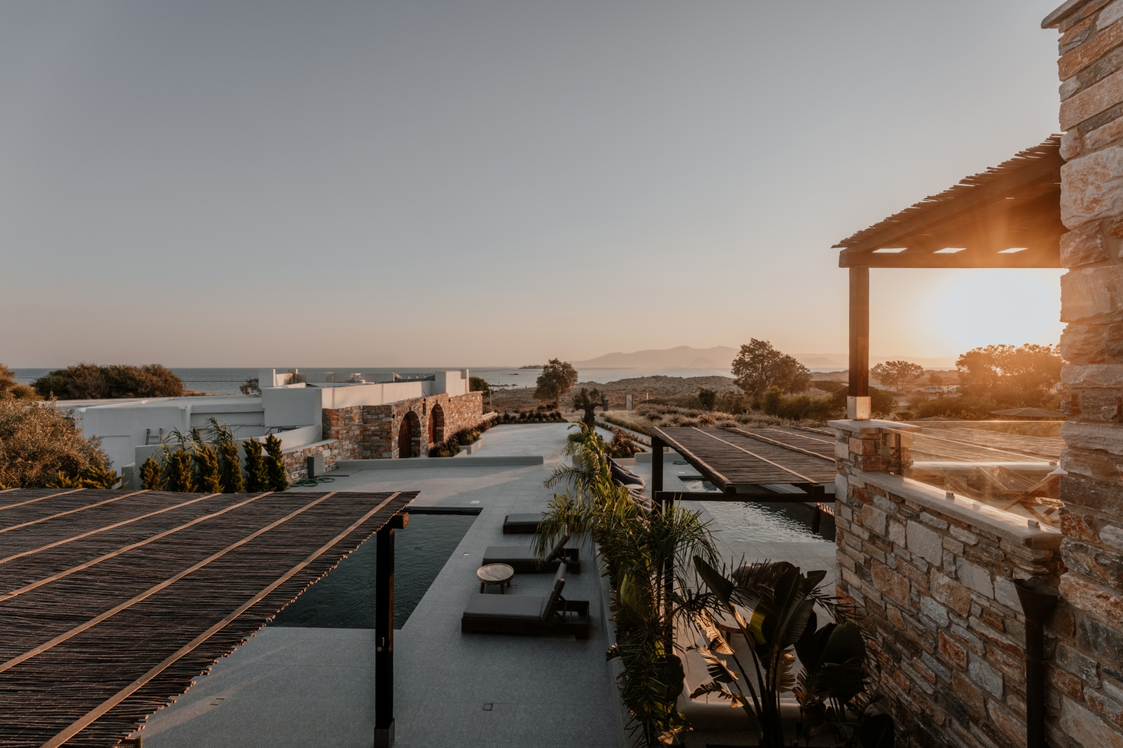 Μεγάλα ανοίγματα κατευθύνουν την κίνηση προς τις πισίνες και τις υπαίθριες ζώνες, επιτρέποντας στο φυσικό φως να εισχωρεί βαθιά και δημιουργώντας μια συνεχόμενη ροή. Τα εξωτερικά υλικά — stone–look επιφάνειες, ξύλινες λεπτομέρειες, πατητή τσιμεντοκονία— επιλέχθηκαν τόσο για την αντοχή τους στο παραθαλάσσιο περιβάλλον όσο και για την αισθητική συνοχή με τον υπόλοιπο σχεδιασμό. Οι ιδιωτικές πισίνες, προσεκτικά χωροθετημένες ώστε να διατηρούν απομόνωση, λειτουργούν ως κέντρα χαλάρωσης που ενισχύουν την αίσθηση ενός παραθαλάσσιου retreat.