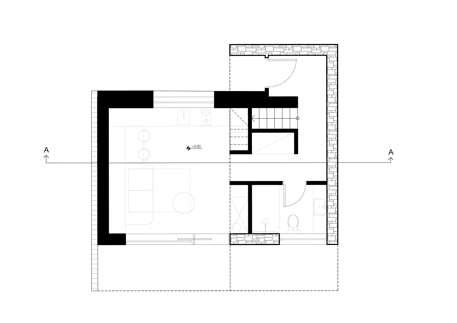 Ο επισκέπτης εισέρχεται στην κατοικία μέσω ενός χαμηλού ύψους διάδρομο, οπού η στωικότητα της πέτρας και του ξύλου προμηνύουν το ευ κατοικείν. Εκεί, κάτω από το πατάρι χωροθετούνται οι βοηθητικές λειτουργίες, ενώ προχωρώντας «ανοίγεται» μπροστά του ο κύριος χώρος της κατοικίας όπου αποκαλύπτεται η θέα των βουνών και το μεγαλείο της φύσης. Στο ανοιχτό πατάρι βρίσκεται ο χώρος του ύπνου. Λειτουργικά, έγιναν οι βασικές και απαραίτητες προσαρμογές, λαμβάνοντας υπόψη τον ελάχιστο χώρο, για μια σύντομη αλλά άνετη διαβίωση.