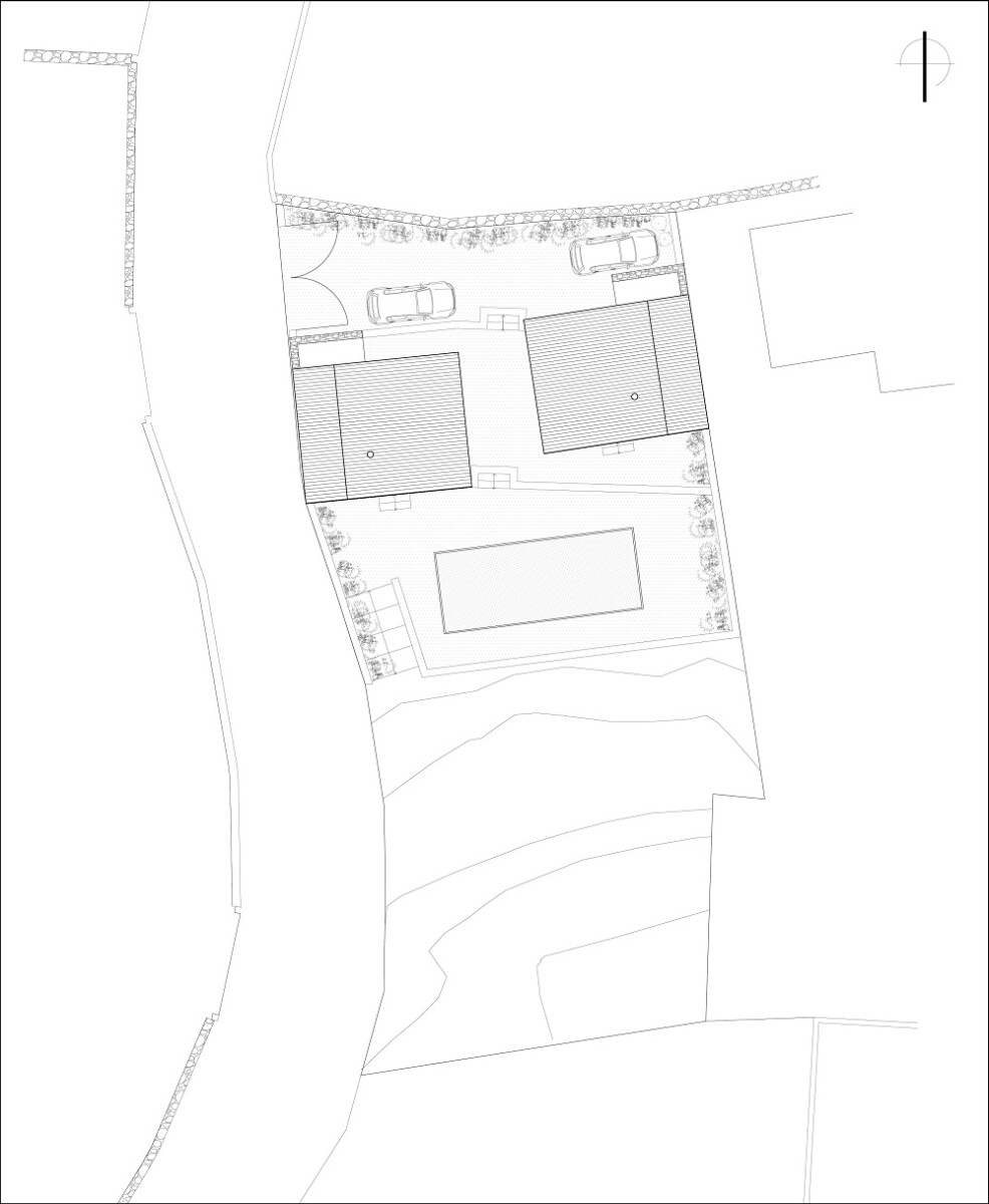 Η τοποθέτηση των κατοικιών στο οικόπεδο εκμεταλλεύεται στο μέγιστο τον προσανατολισμό ανοίγοντας σχεδόν ολόκληρη την νότια πλευρά για τον βέλτιστο ηλιασμό ακόμη και τις χειμωνιάτικες μέρες, ενώ ταυτόχρονα προστατεύεται από το ψύχος του βορρά, στον οποίο υπάρχει ένα μικρό άνοιγμα για τον αερισμό του χώρου. Τέλος ,η συνδιαλλαγή των δύο κατοικιών, μέσω της τοποθέτησης τους στον χώρο και της γεωμετρίας τους, θυμίζουν τις κορυφές των βουνών που περικλείουν αυτές και το χωρίο, ενσωματώνοντας τες στο τοπίο.