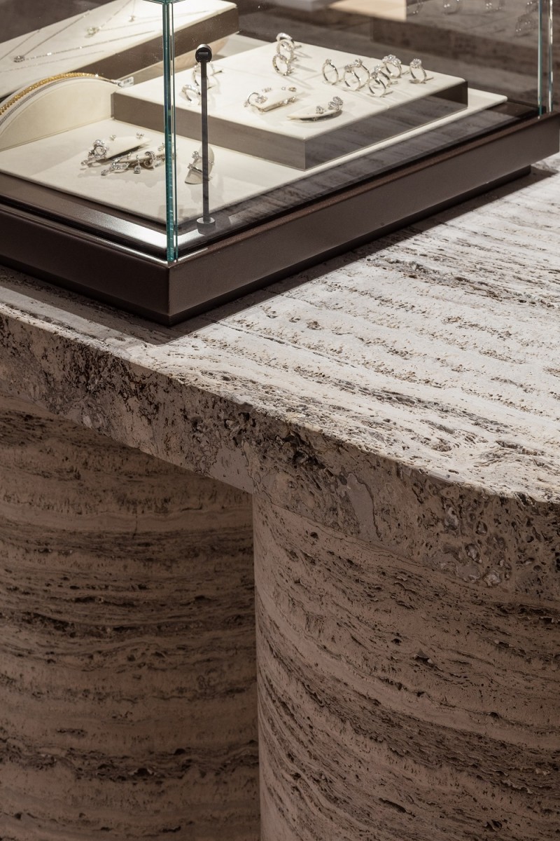 Σημείο αναφοράς αποτελεί το κεντρικό μασίφ έπιπλο από μάρμαρο travertine silver που μοιάζει βγαλμένο από βράχο. Πρόκειται για ένα έπιπλο από λαξευμένο μάρμαρο που δίνει την αίσθηση των κυμάτων που λαξεύουν τους βράχους στο φυσικό τοπίο του νησιού. Η κυματοειδής επένδυση στο φόντο του καταστήματος στο χαρακτηριστικό μπλε χρώμα του brand, προσφέρει μια ξεχωριστή πινελιά στην ταυτότητα του κοσμηματοπωλείου.