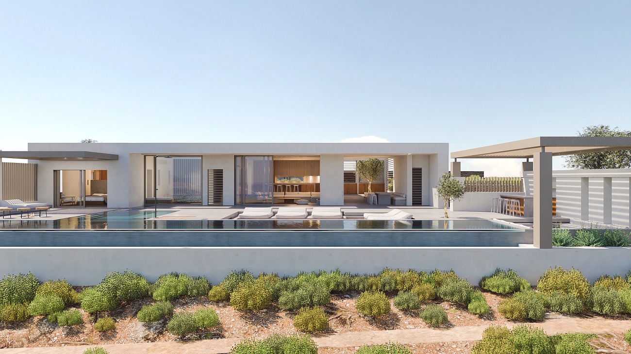 Το στοιχείο του νερού έχει πρωταγωνιστικό και οργανωτικό ρόλο των χρήσεων και των κινήσεων, καθώς η μεγάλη πισίνα σε σχήμα Τ διατρέχει από άκρη σε άκρη τον εξωτερικό χώρο, ενώ προσφέρει την αίσθηση της οπτικής συνέχειας με την επιφάνεια της θάλασσας.