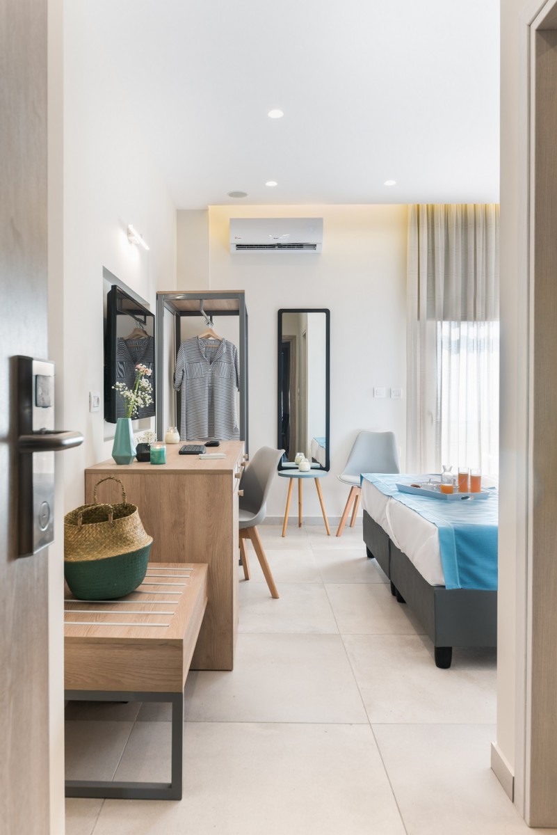 Ο σχεδιασμός των δωματίων διαθέτει επιρροές από τον αρχιτεκτονικό ιδιαίτερο χαρακτήρα του νησιού δίνοντας όμως νέες φόρμες που απαντούν στις σύγχρονες ανάγκες του ταξιδιώτη με επαγγελματικό ενδιαφέρον.