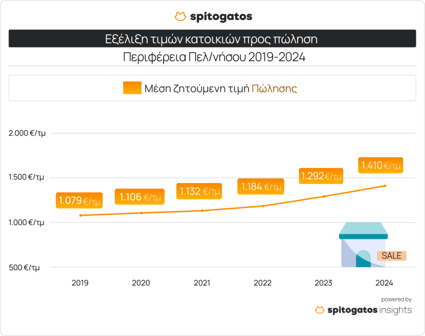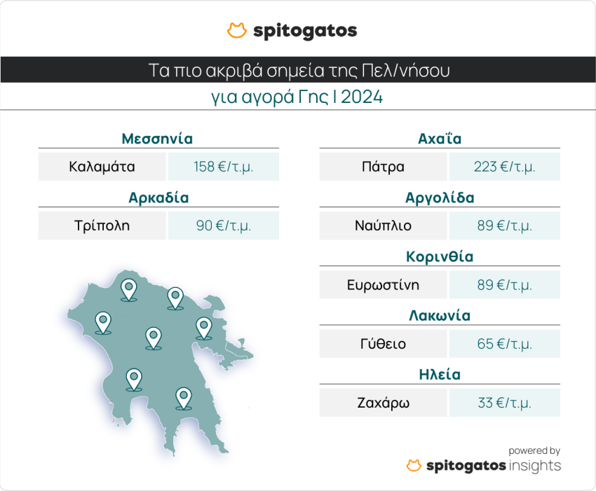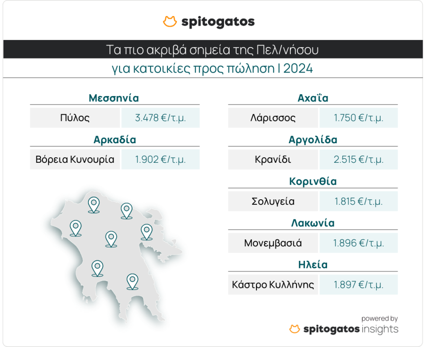 Όσον αφορά τα διαμερίσματα προς πώληση, τα δημοφιλέστερα σημεία για το 2024 περιλαμβάνουν την Πάτρα, την Καλαμάτα, το Ναύπλιο, τη Σπάρτη και την Κόρινθο. Ακολουθούν το Λουτράκι-Περαχώρα, ο Πύργος, η Τρίπολη, το Άργος, το Ξυλόκαστρο και το Αίγιο. Ενδεικτικά, η μέση ζητούμενη τιμή πώλησης διαμερίσματος στην Πάτρα ανέρχεται στα 1.385 €/τ.μ., στην Καλαμάτα στις 2.719 €/ τ.μ. και στο Ναύπλιο στις 2.353 €/τ.μ.