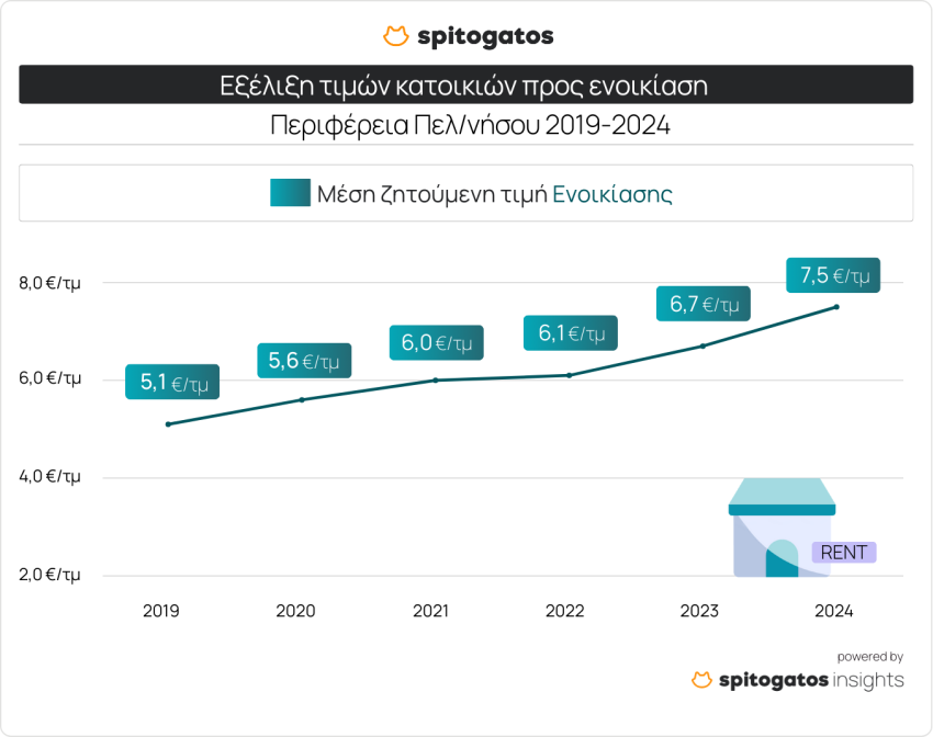 Σύμφωνα με την ανακοίνωση, εξετάζοντας την εξέλιξη της μέσης ζητούμενης τιμήςκατοικιών προς πώλησηστην Πελοπόννησο την περίοδο 2019-2024, διαπιστώνεται εντυπωσιακή αύξηση της τάξης του 30,7%, ενώ ειδικά κατά την περίοδο 2023-2024 καταγράφηκε περαιτέρω άνοδος 9,1%. Όσον αφορά την ενοικίαση κατοικιών, σημειώνεται σημαντική αύξηση της μέσης ζητούμενης τιμής στην Πελοπόννησο, η οποία υπερβαίνει το 45,0% από το 2019 έως το 2024.