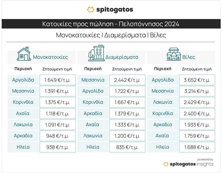 Στις μονοκατοικίες, η Αργολίδα κατέχει την πρωτιά με την υψηλότερη μέση ζητούμενη τιμή πώλησης, ενώ ακολουθούν η Μεσσηνία και η Κορινθία. Αντίθετα, για όσους αναζητούν πιο οικονομικές λύσεις, οι περιοχές της Αρκαδίας και της Ηλείας προσφέρουν προσιτές επιλογές. Όσον αφορά τα διαμερίσματα, η υψηλότερη μέση ζητούμενη τιμή καταγράφεται στη Μεσσηνία, με την Αργολίδα και την Κορινθία να ακολουθούν στη δεύτερη και τρίτη θέση, αντίστοιχα. Για πιο προσιτές επιλογές διαμερισμάτων, οι ενδιαφερόμενοι μπορούν να στραφούν στην Ηλεία και τη Λακωνία.