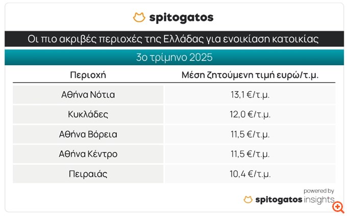 Όσον αφορά τις κατοικίες προς ενοικίαση, και πάλι τα Νότια Προάστια έχουν την πρωτοκαθεδρία στις πιο ακριβές περιοχές της χώρας με τη ΜΖΤ ενοικίασης να ανέρχεται στα 13,1 ευρώ/τ.μ. Ακολουθούν οι Κυκλάδες που έχασαν την πρώτη θέση που κατείχαν κατά το 2ο τρίμηνο του 2025, τα Βόρεια Προάστια της Αθήνας, το κέντρο της Αθήνας και ο Πειραιάς με ΜΖΤ ενοικίασης κατοικίας στα 10,4 ευρώ/τ.μ.