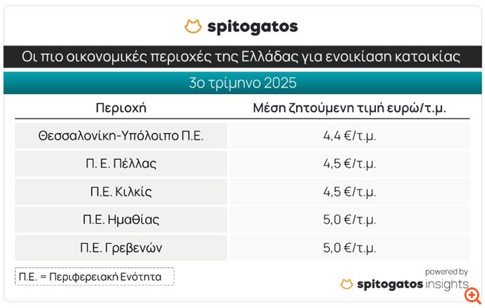 Σε ό,τι αφορά την ενοικίαση κατοικίας, στο top 5 με τις πιο οικονομικές περιοχές της χώρας κατά το 3ο τρίμηνο του 2025 συγκαταλέγονται το υπόλοιπο Π.Ε. Θεσσαλονίκης, οι Π.Ε. Πέλλας, Κιλκίς, Ημαθίας και Γρεβενών.