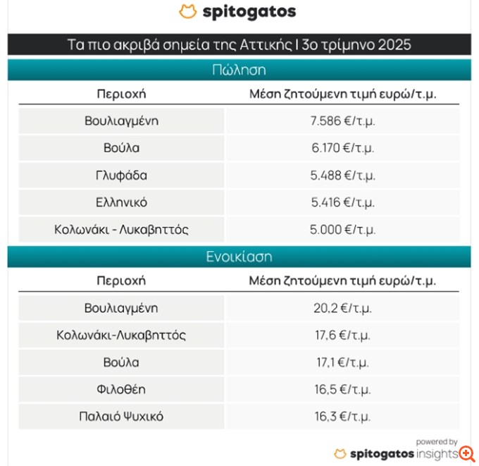 Οι top 5 πιο ακριβές περιοχές για ενοικίαση κατοικίας στην Αττική είναι η Βουλιαγμένη και η Βούλα στα Νότια Προάστια, η περιοχή Κολωνάκι-Λυκαβηττός στο κέντρο της Αθήνας, η Φιλοθέη και το Παλαιό Ψυχικό με ΜΖΤ στα 16,3 ευρώ/τ.μ.