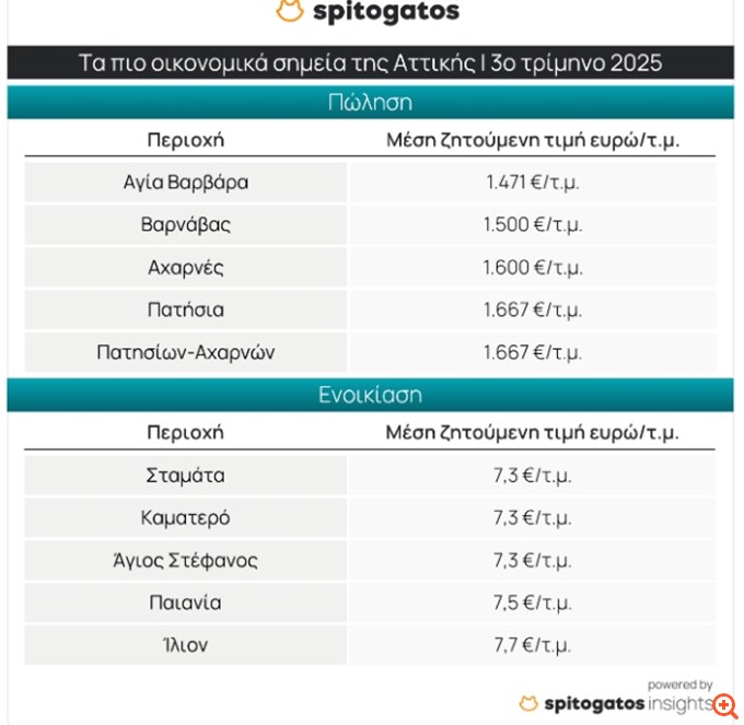 Οικονομικές επιλογές σε ό,τι αφορά την ενοικίαση κατοικίας κατά το 3ο τρίμηνο του 2025 εντοπίζονται σε Σταμάτα (7,3 ευρώ/τ.μ.), Καματερό (7,3 ευρώ/τ.μ.), Άγιο Στέφανο, Παιανία και Ίλιον.