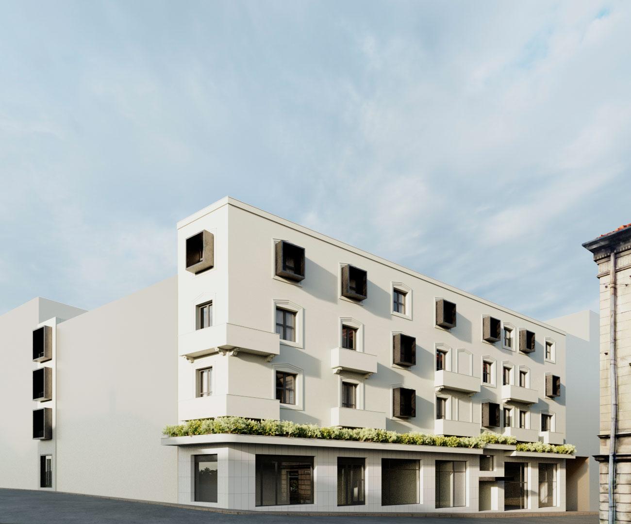 “Besides the street, black steel frames openings creating architectural extrusions”.