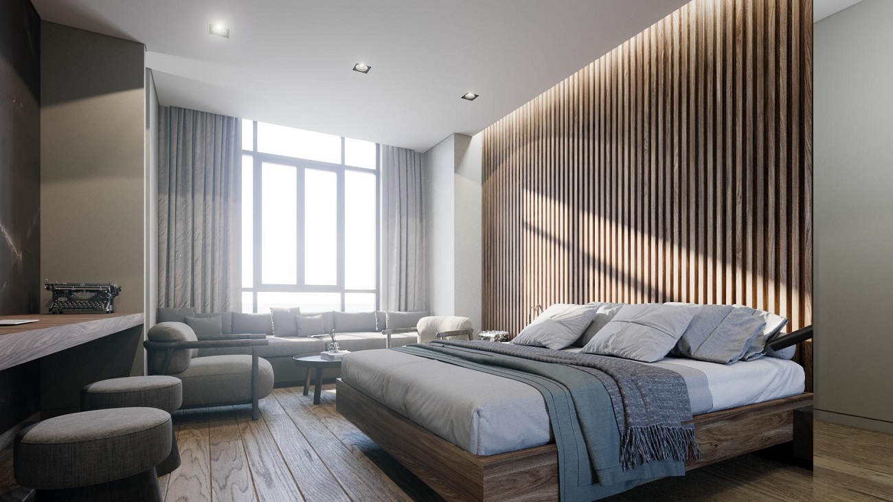 Στο κεντρικό αίθριο, τα ανοίγματα των δωματίων, ενσωματώνονται σε κάθετες μεταλλικές επιφάνειες, που οδηγούν το βλέμμα του επισκέπτη προς τα πάνω μέσα από τη γυάλινη οροφή.