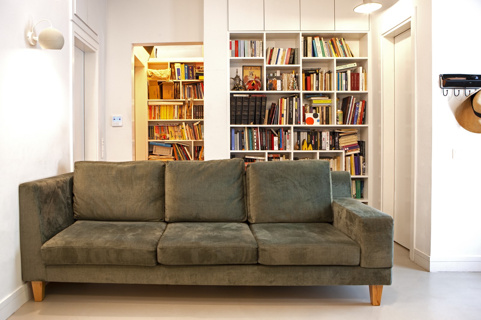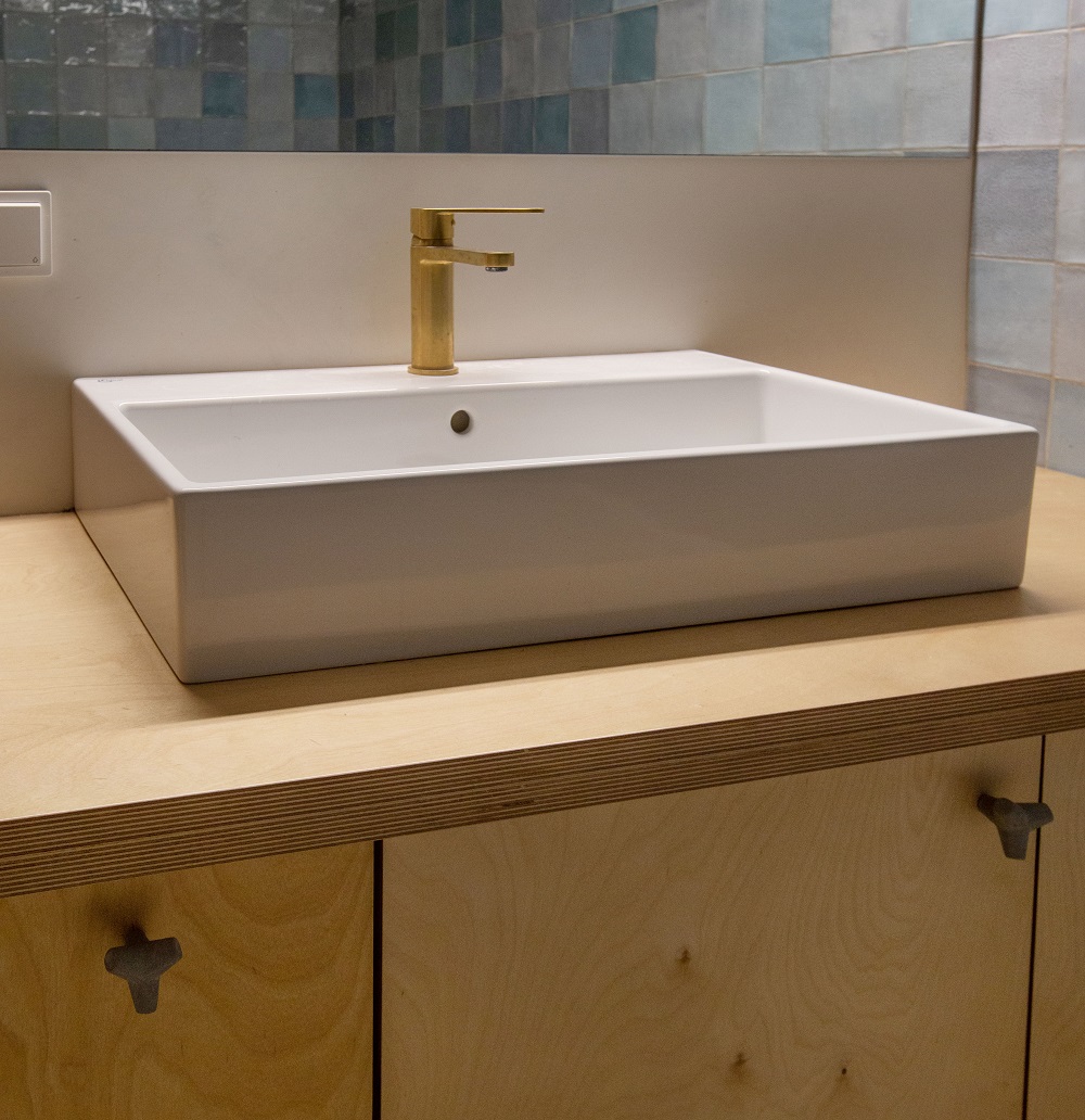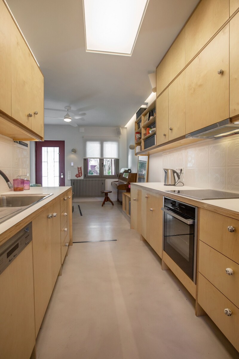 Although located within a dense urban environment, the house maintains a direct relationship with soil and nature. The material palette —cement screed flooring and natural birch plywood cabinetry— preserves a sense of rawness and clarity consistent with this connection. All built-in elements, from bookshelves to wardrobes and living room furniture, were custom-designed to reinforce spatial continuity and fluidity, allowing the family to inhabit a home that fully expresses their way of life.
