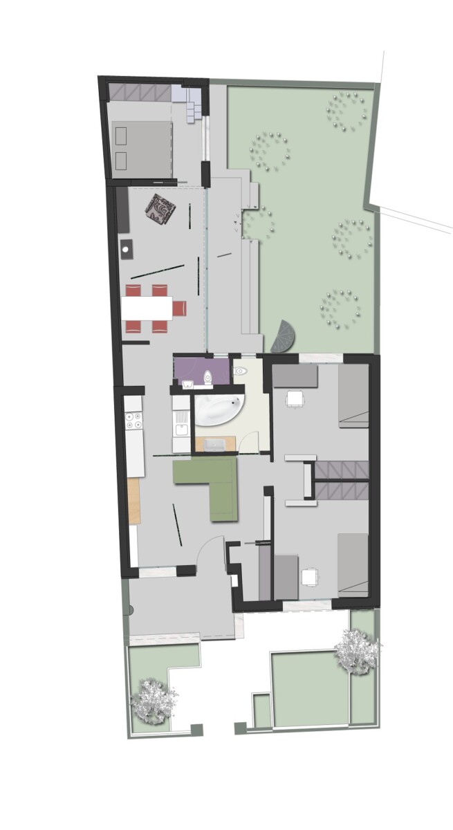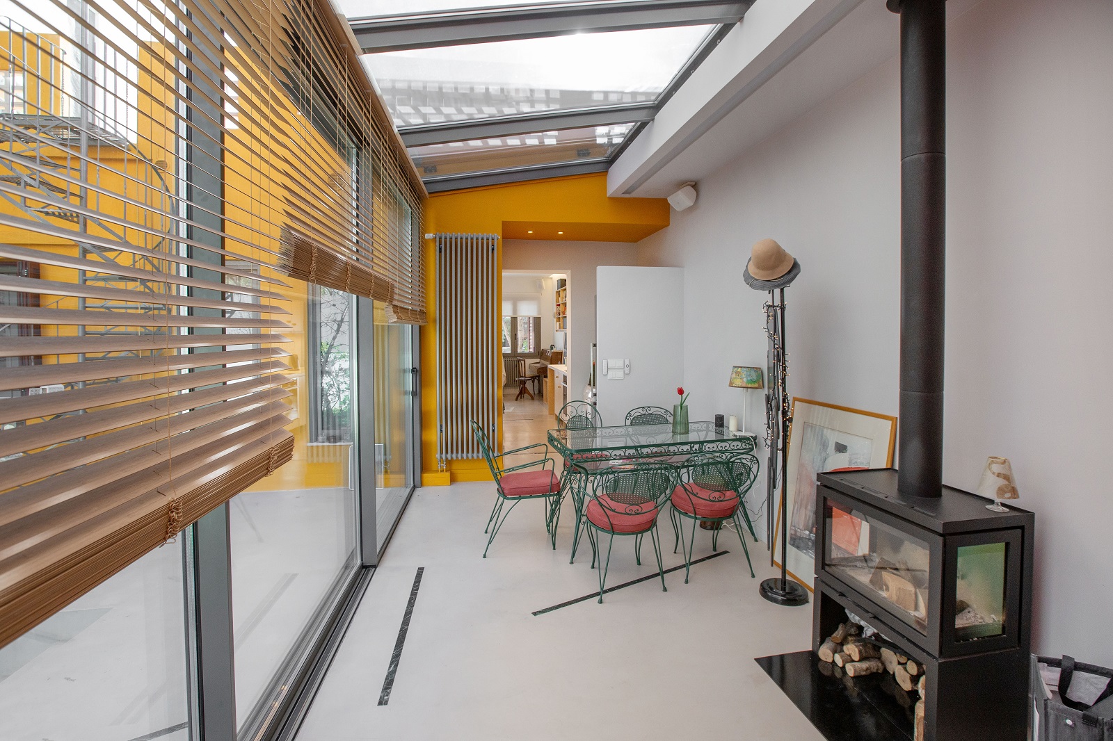 Preserving the strong character of the backyard was a key objective. The connection between the two buildings was achieved through the insertion of a semi-transparent atrium that maintains, to some extent, the qualities of an open-air space while functioning as a habitable zone and a passageway. For nearly half the year, it effectively becomes an extension of the courtyard. The dialogue between interior and exterior is constant—visually and spatially—transforming the garden into a framed stage for everyday life.
