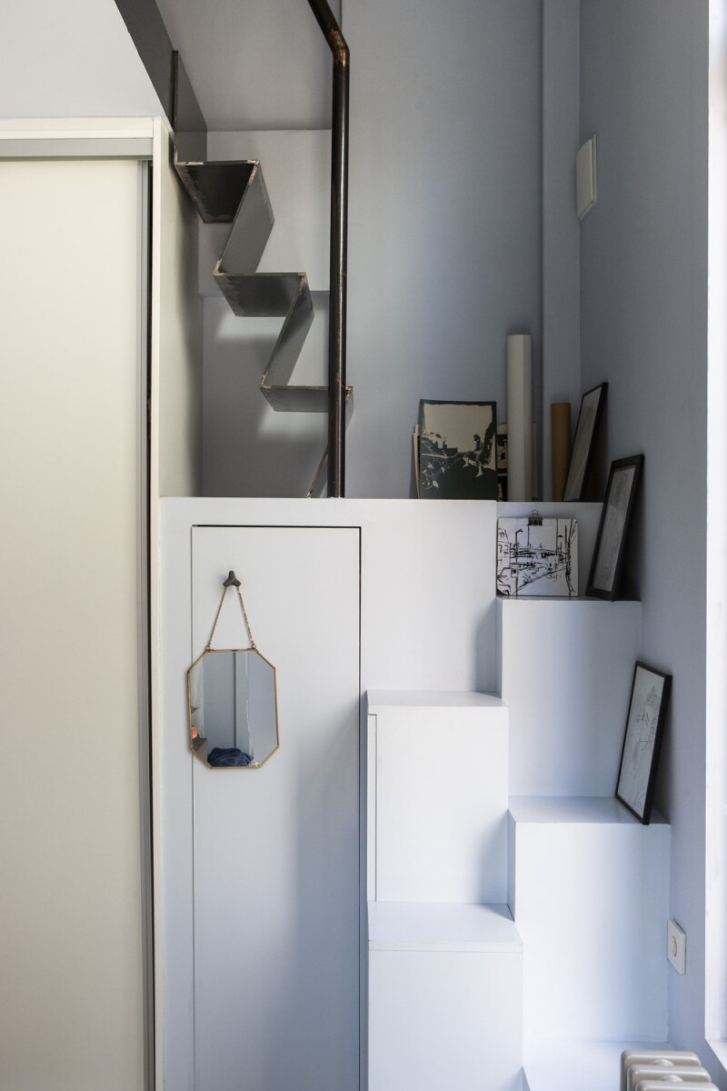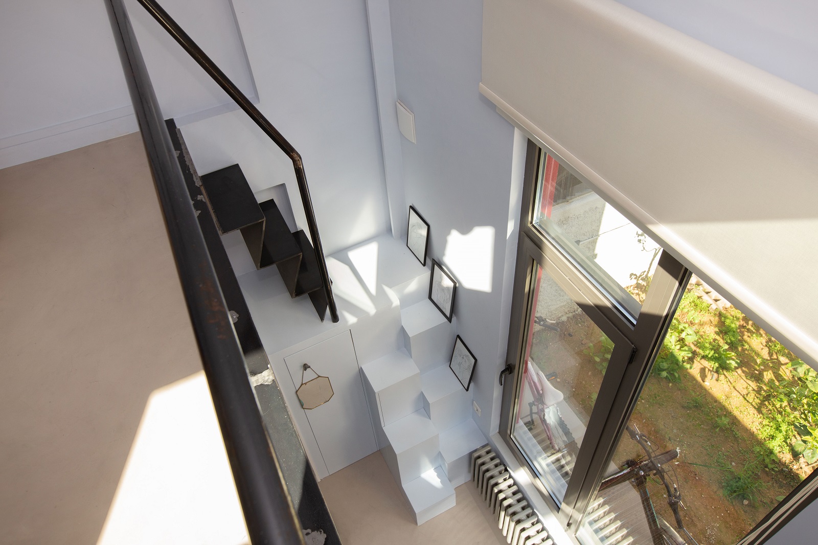 The teenagers’ rooms feature hidden sliding doors disguised as bookshelves, reflecting both their desire for retreat and the design’s playful spirit. In the parents’ bedroom, a sculptural staircase leads to the mezzanine office—a hybrid construction where the lower section is a painted wooden volume in the color palette of the room, while the upper steps are folded sheet metal left in their natural finish.