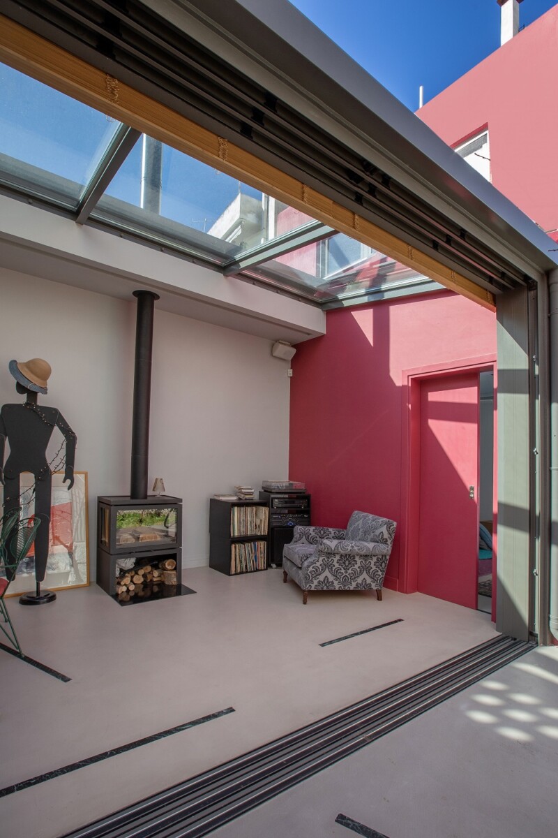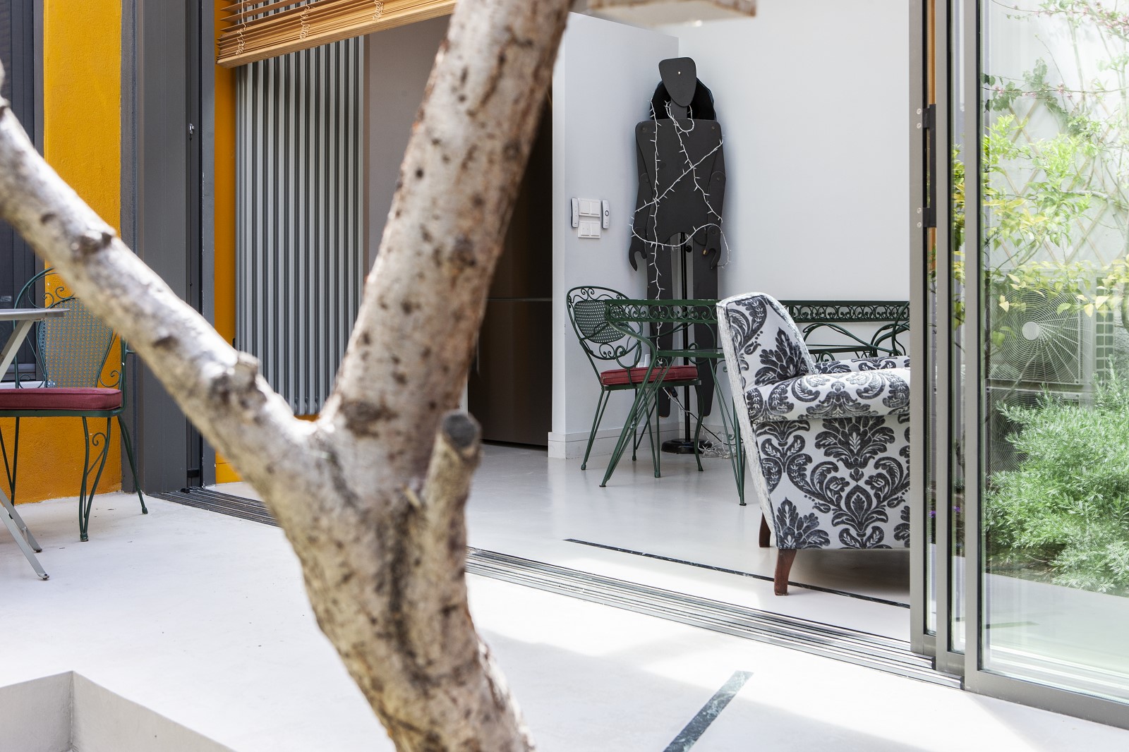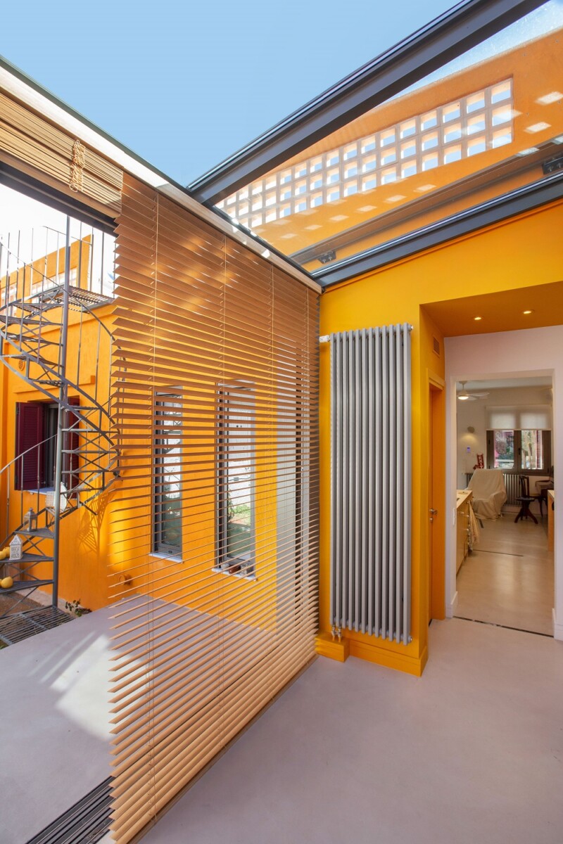 Στην πίσω αυλή αναπτύσσεται ένας άλλος κόσμος: ένα patio γεμάτο εσωτερικότητα, φως και έντονα χρώματα. Οι διαφορετικοί χρωματισμοί των δύο όγκων τονίζουν τη διαφάνεια του αιθρίου και αντλούν έμπνευση από τη μεξικανική αρχιτεκτονική, ειδικότερα από τον Luis Barragán. Κατά τη μετάβαση από τον έναν χώρο στον άλλον, ο επισκέπτης βιώνει μια αποκάλυψη: το ύψος και η διαφάνεια του αιθρίου, μαζί με το άνοιγμα προς τον κήπο, προκαλούν το αίσθημα της έκπληξης, αποκαλύπτοντας έναν χώρο ταυτόχρονα ανοιχτό και απολύτως ιδιωτικό.