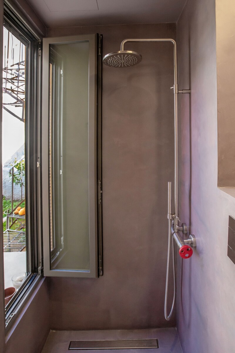 Subtle details enrich the sensory experience of the space: thin inlays of Tinos marble embedded in the cement floor, asymmetrically placed stone handles in the kitchen, mirrors on the ceiling of the teenagers’ corridor and a curtain separating the WC from the rest of the bathroom. These gestures evoke surprise, contrast, flow, and discovery—heightening the lived experience of a home designed around movement, transition, and revelation.