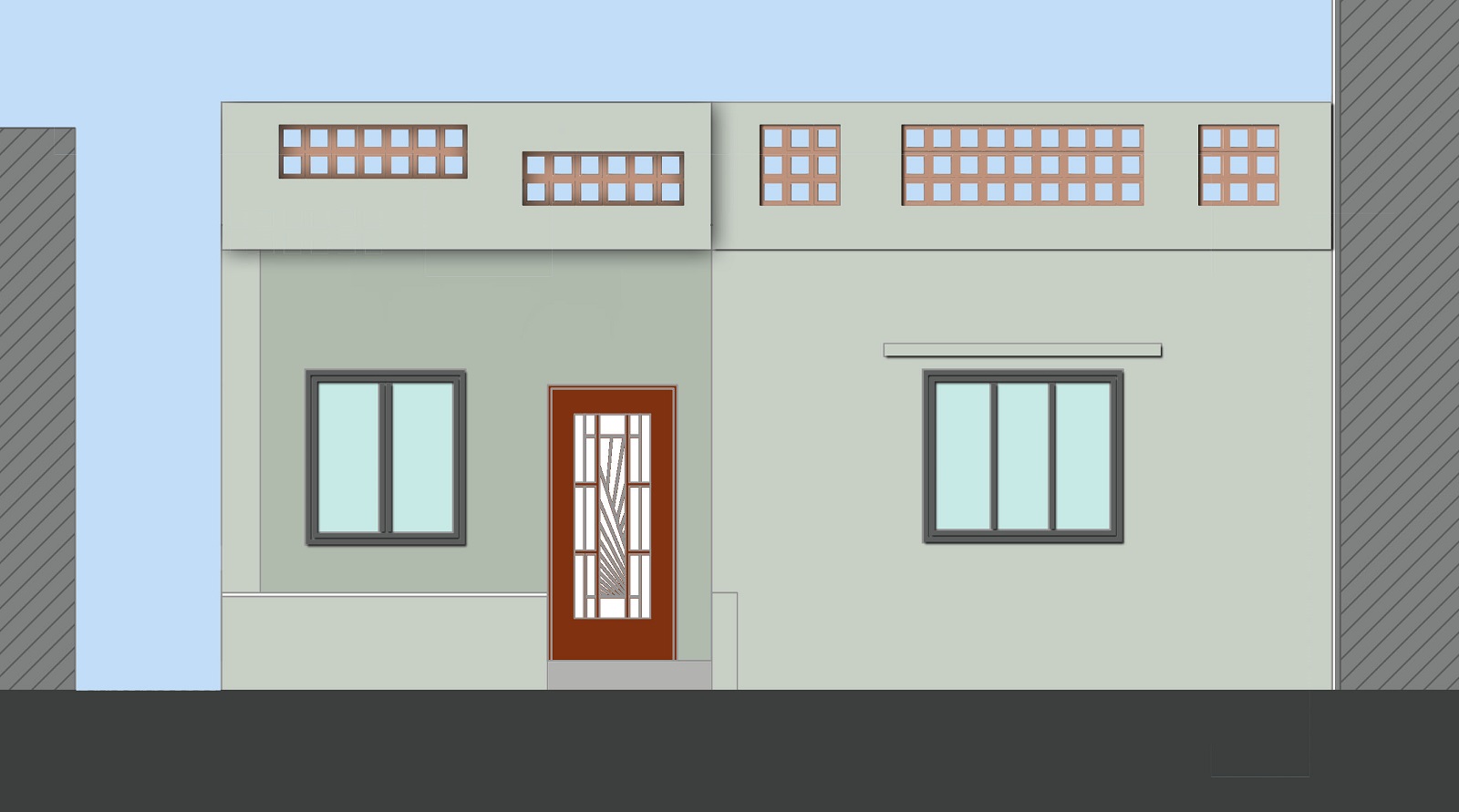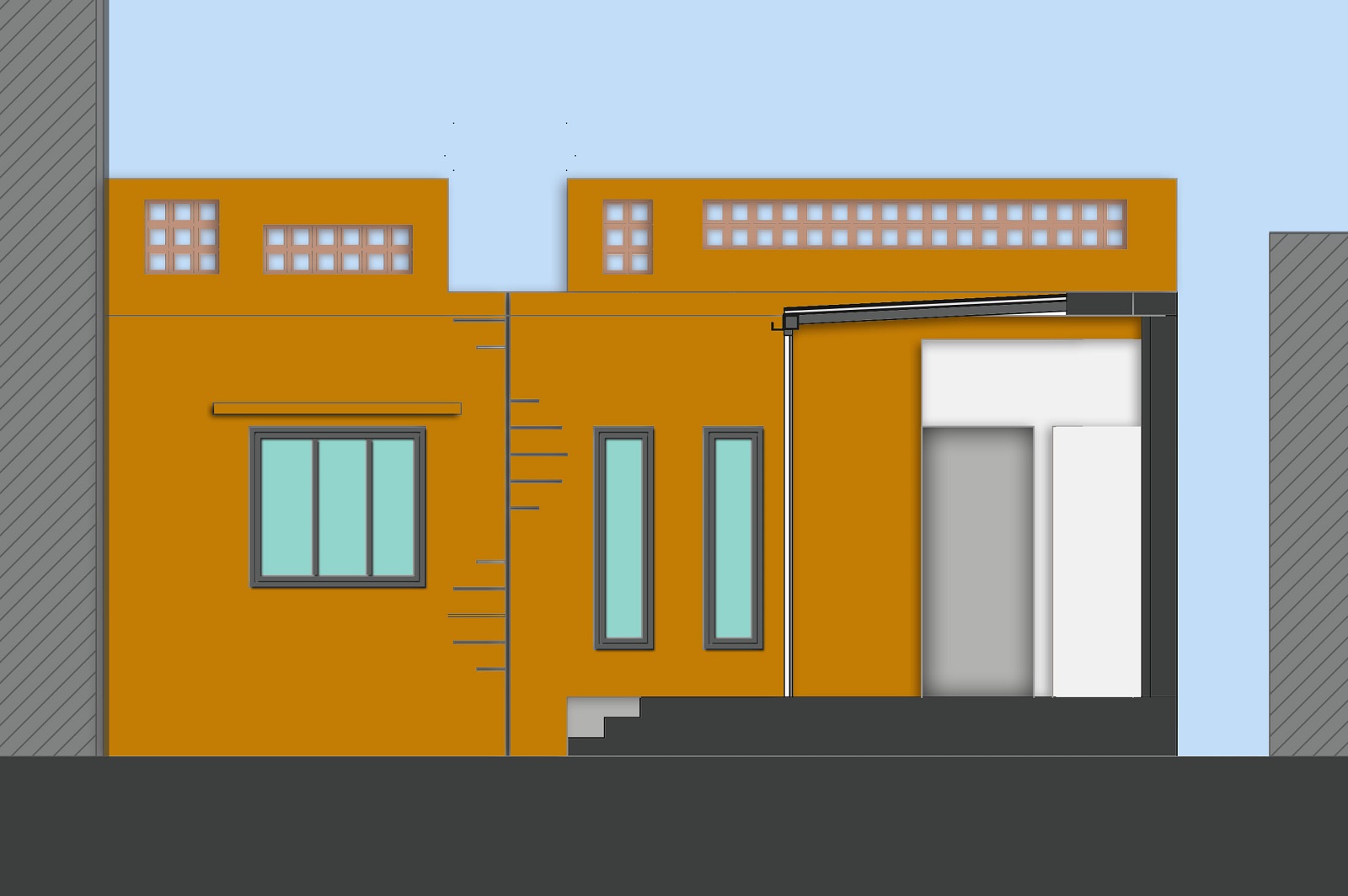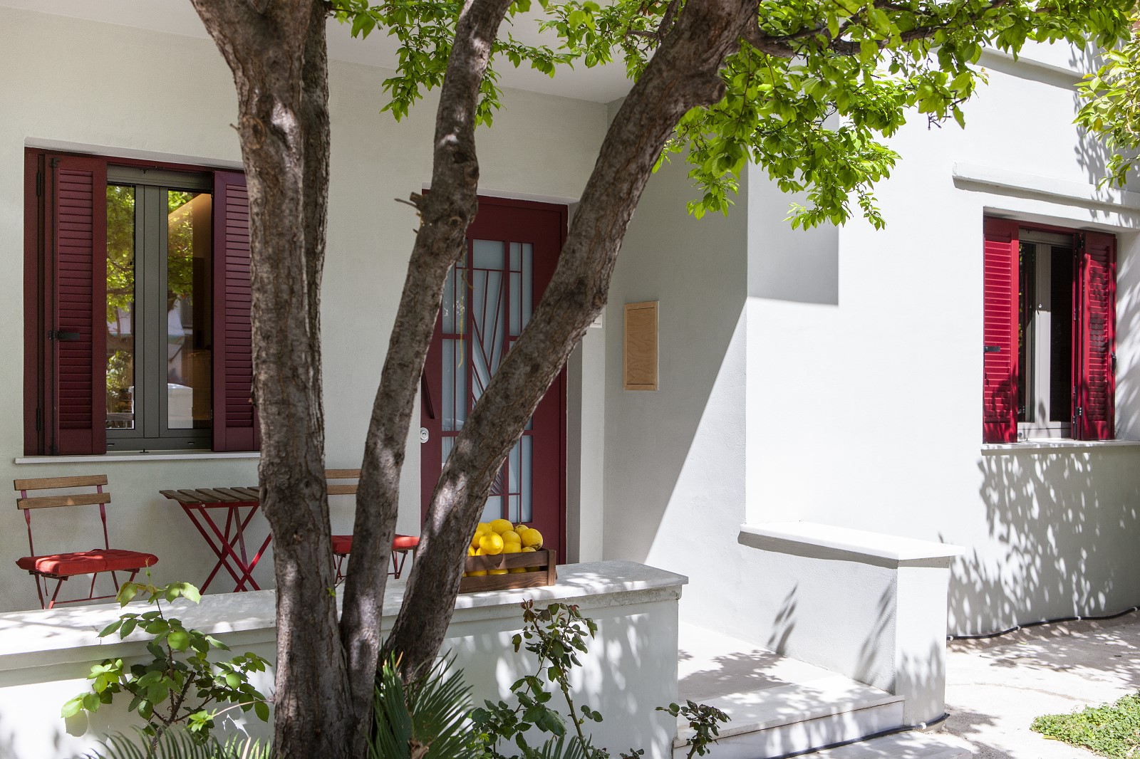 Στην μπροστινή αυλή, σε επαφή με τον δρόμο, διατηρήθηκε η μορφή της λαϊκής κατοικίας του ’60. Αντί για συμπαγές στηθαίο, τοποθετήθηκαν κλώστρα ως αναφορά στην εποχή, ενώ η εξώθυρα σχεδιάστηκε εμπνευσμένη από τα γεωμετρικά σχέδια θυρών της περιόδου. Ο δρόμος διατηρεί ακόμη μια ακολουθία από παλιές μονοκατοικίες· επιδιώκοντας τη συνέχιση του αστικού ιστού και τη διατήρηση της εμπειρίας του περιπατητή, επισκευάστηκαν τα χαμηλά κάγκελα και η αυλόπορτα, με επιλογή χρωμάτων που «συνομιλούν» με τον περιβάλλοντα χώρο.
