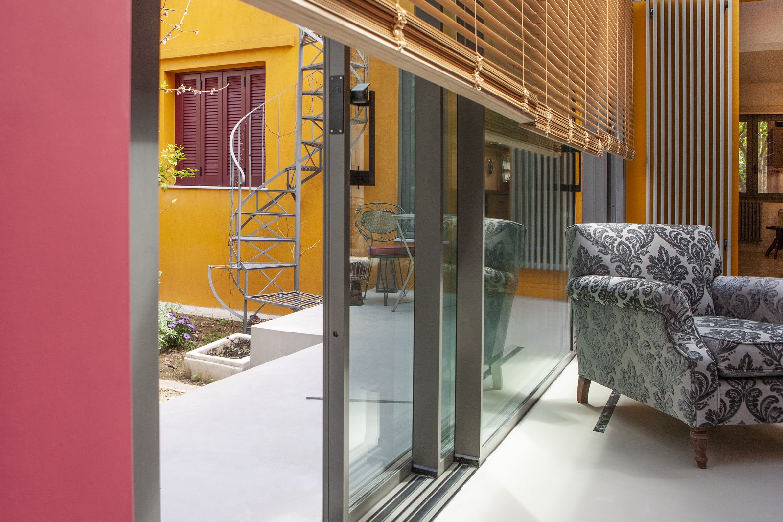 On the street-facing side, the façade of the 1960s house was carefully preserved. Instead of a solid parapet, clostra blocks were introduced, referencing mid-century domestic architecture, while the entrance door was designed in homage to the geometric patterns typical of that era. The street is lined with a sequence of old single-story homes, and in an effort to maintain the continuity of the urban fabric and the pedestrian experience, the low railings and gate were restored and repainted in tones that harmonize with the surrounding context.