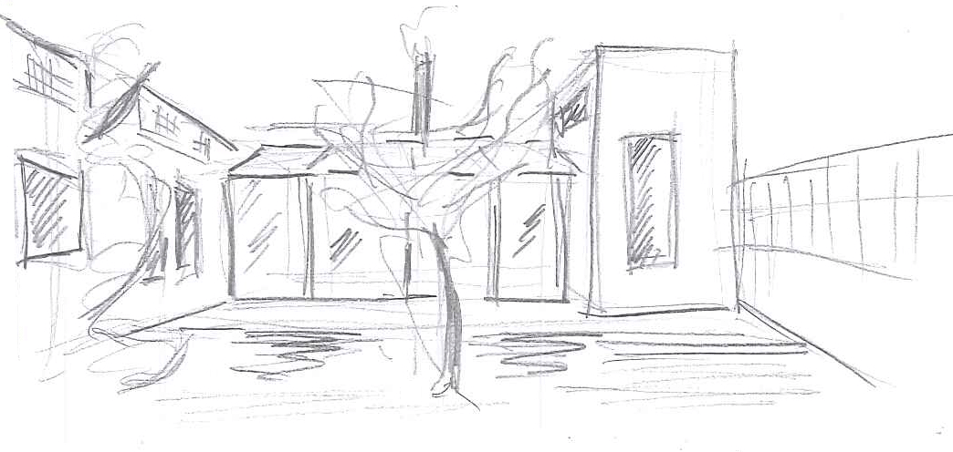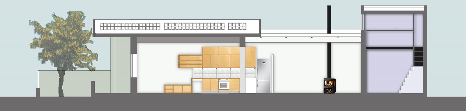 Η γοητεία της πίσω αυλής ήταν έντονη και η διατήρησή της αποτέλεσε βασική επιδίωξη. Η σύνδεση των δύο κτισμάτων επιτεύχθηκε μέσω ενός αιθρίου· ενός ημιδιάφανου χώρου που διατηρεί, εν μέρει, τα χαρακτηριστικά του υπαίθριου, λειτουργεί ως βιώσιμος χώρος και πέρασμα, και για έξι μήνες το χρόνο γίνεται οργανικό τμήμα της αυλής. Η σχέση εσωτερικού–εξωτερικού χώρου είναι διαρκής, κυρίως μέσω της οπτικής επαφής, μετατρέποντας τον κήπο σε σκηνικό της καθημερινότητας.
