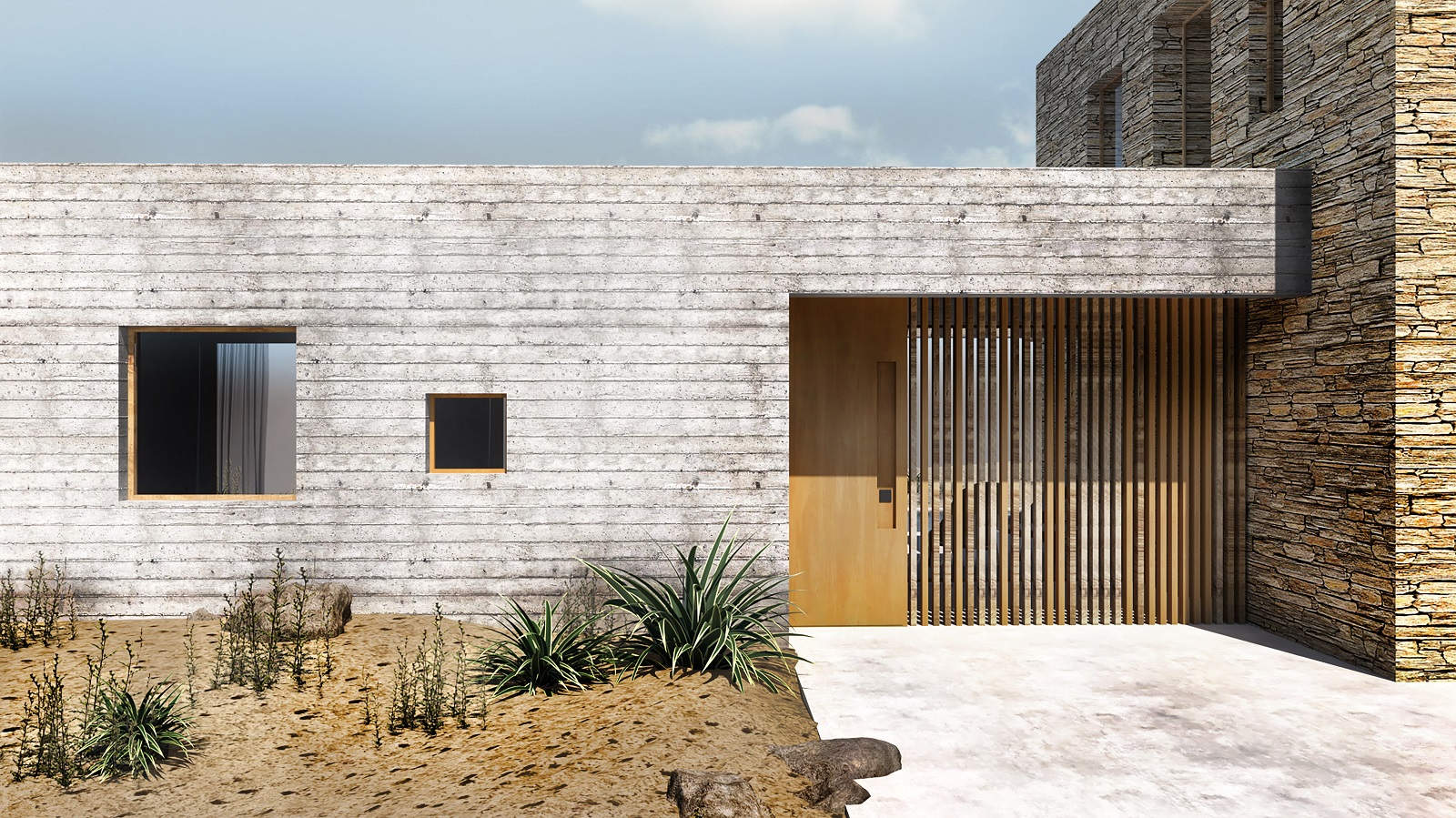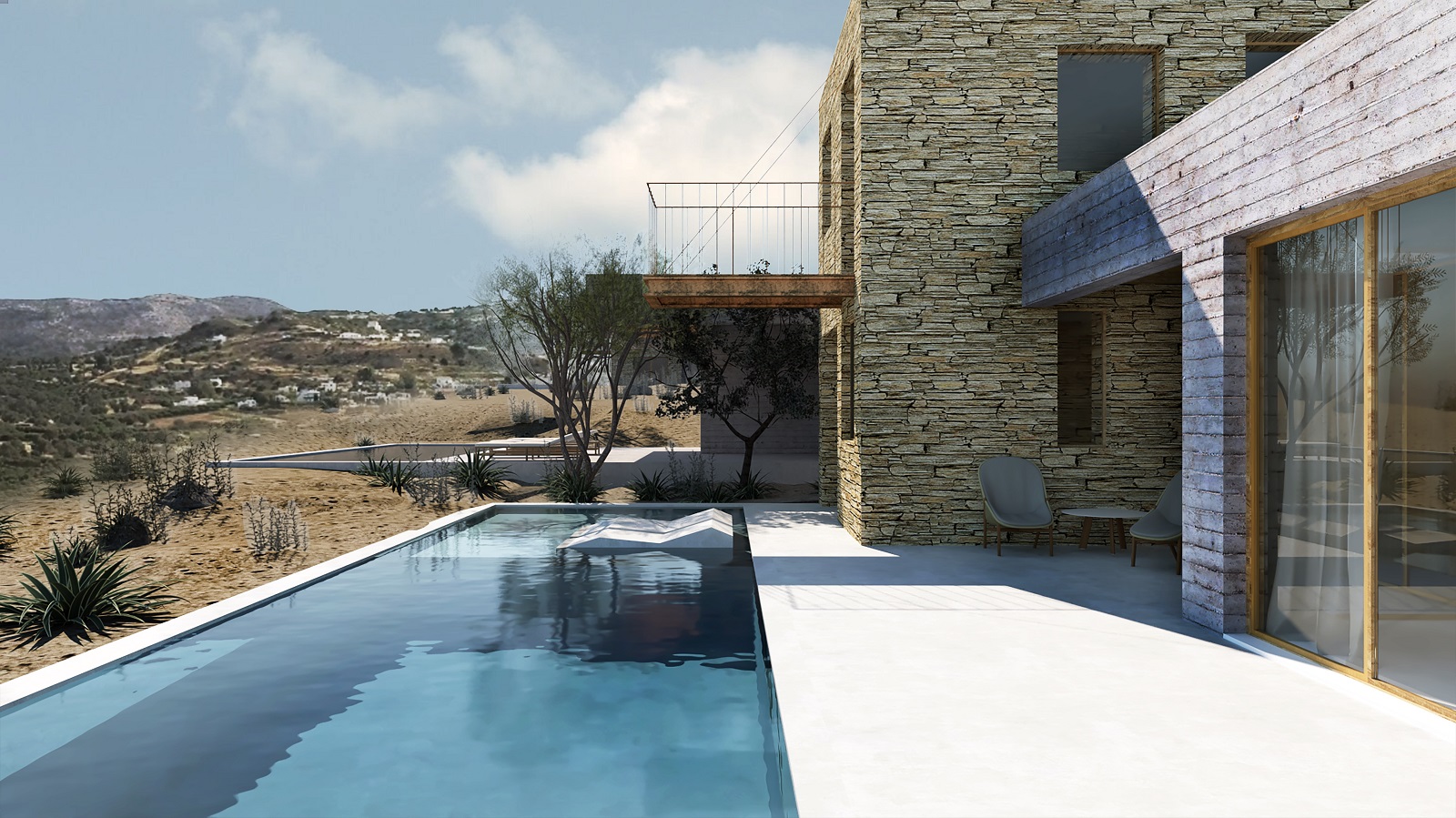 Τέλος, μια παλέτα παραδοσιακών και φυσικών υλικών, όπως η τοπική πέτρα και το ξύλο, εφαρμόζονται σε αρμονία με σύγχρονα υλικά, όπως το εμφανές σκυρόδεμα, γεφυρώνοντας το χάσμα μεταξύ της παραδοσιακής αρχιτεκτονικής και της σύγχρονης ζωής.
