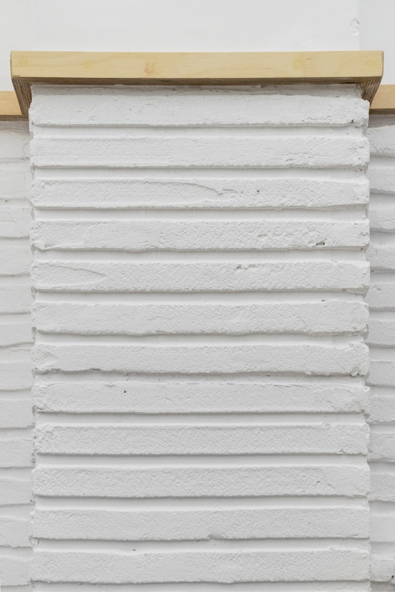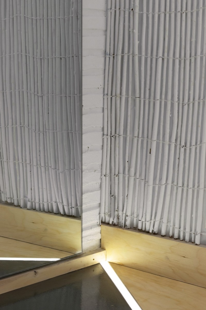 The plaster carved lines form delicate and tenuous shadow lines which contribute to the overall dramatic game of perspective-ness. The hand-pulled finishing is framed through a white birch wooden slat which spans the whole perimeter and serves as the fitting rooms’ threshold.